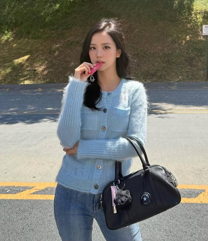지수는 최근 자신의 인스타그램에 할머니 옷장에서 꺼낸 듯한 민트빛이 감도는 화사한 스카이 블루 컬러의 클래식한 카디건룩을 게재했다.