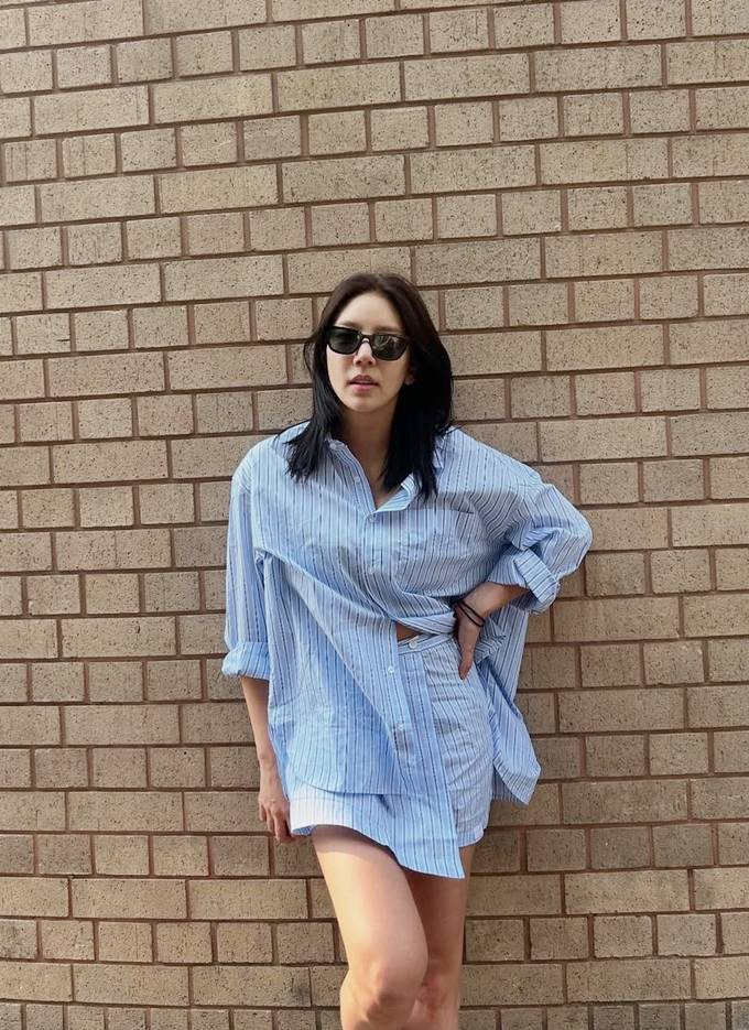 공개한 사진에서 손담비는 스트라이프 랩 쇼츠와 오버핏 셔츠 셋업의 외출룩으로 패셔니스타 다운 감각적인 스타일을 연출했다.