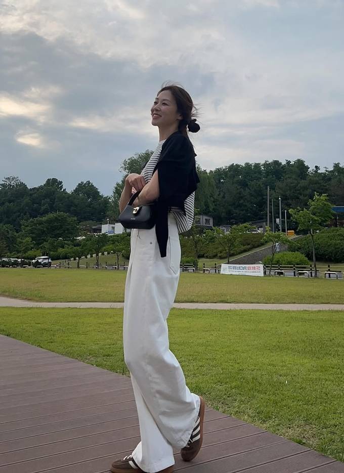 공개한 사진에서 장신영은 공원 산책에서는 반팔 스트라이프 티셔츠에 화이트 팬츠를, 안에서는 긴팔 스트라이프에 짧은 반바지를 매치해 스타일리시한 여름 스타일을 완성했다.