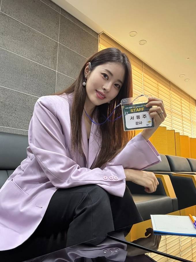 공개한 사진에서 서동주는 블랙 팬츠와 블랙 티셔츠 톱에 보라빛 재킷을 걸친 캐주얼 슈트로 지적이면서도 스마트한 강사룩을 선보였다.