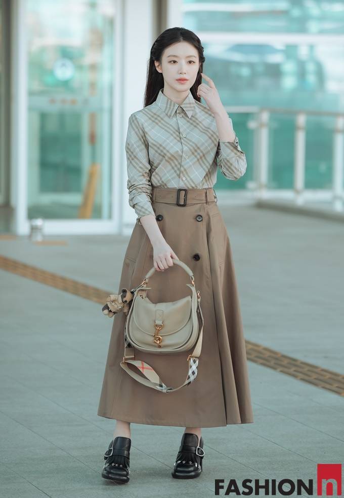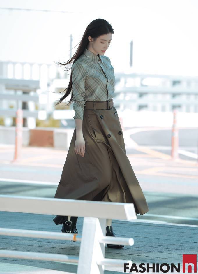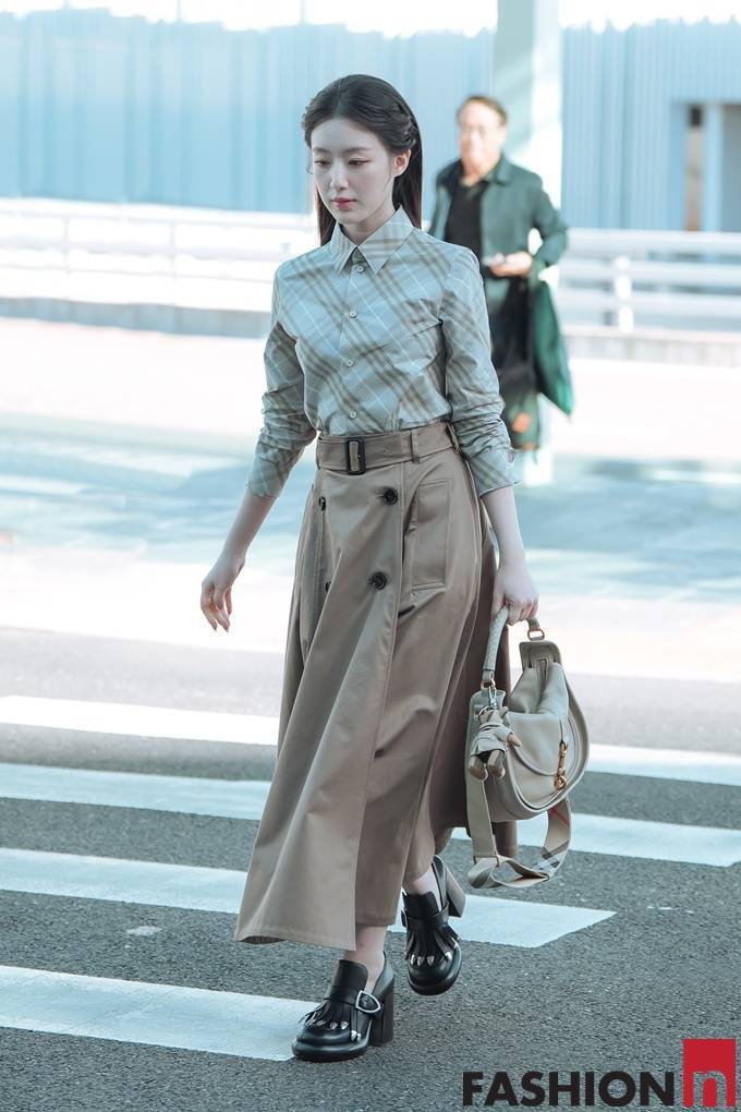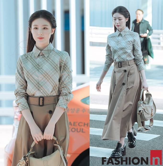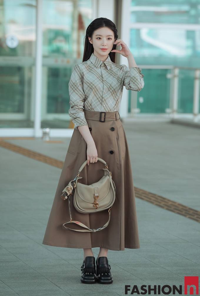 이날 슈화는 사선 체크 셔츠와 A라인의 트렌치 플레어 스커트를 매치한 클래식한 가을 투피스룩으로 공항패션을 연출했다.