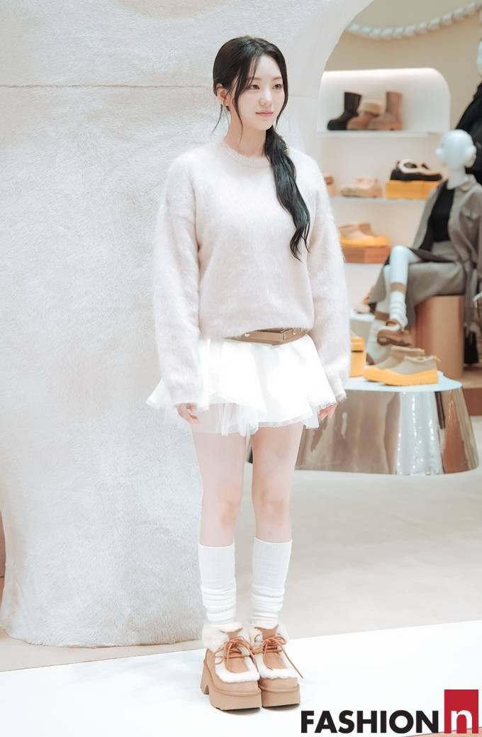 특히 퍼 디테일이 돋보이는 어그 슈즈에 니삭스를 더해, 러블리하면서도 트렌디한 무드를 완성했다.