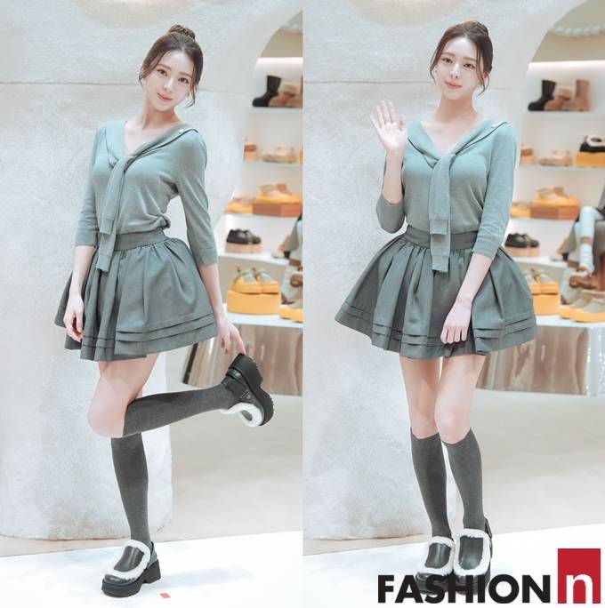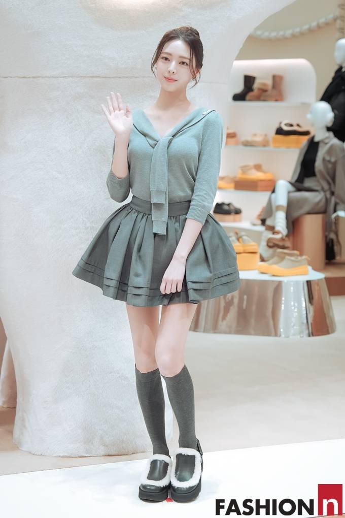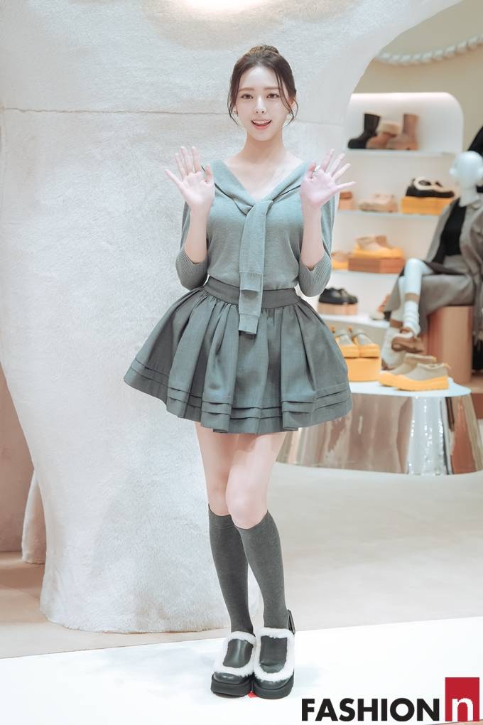 여깅 니하이 삭스와 퍼 디테일이 들어간 어그 슈즈를 더해 겨울 특유의 포근함과 귀여움을 동시에 담아냈다.