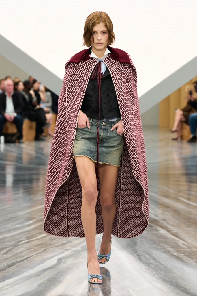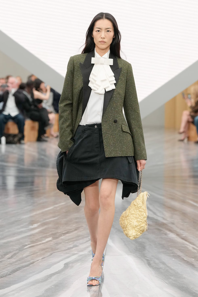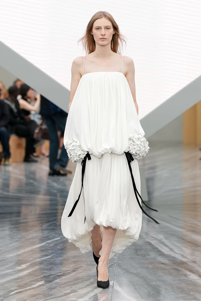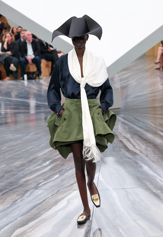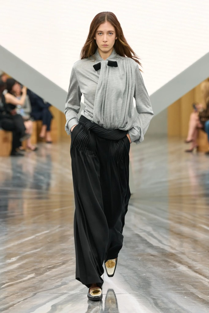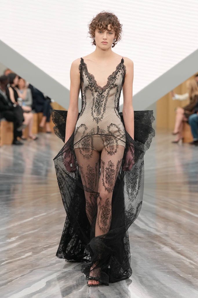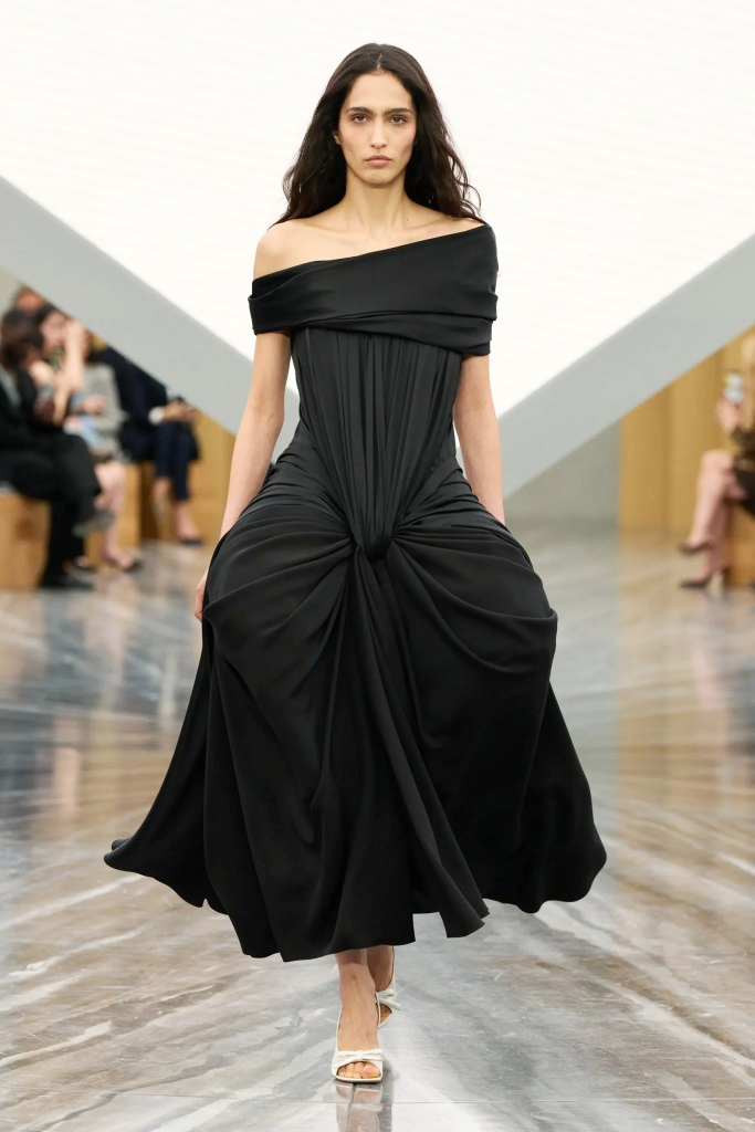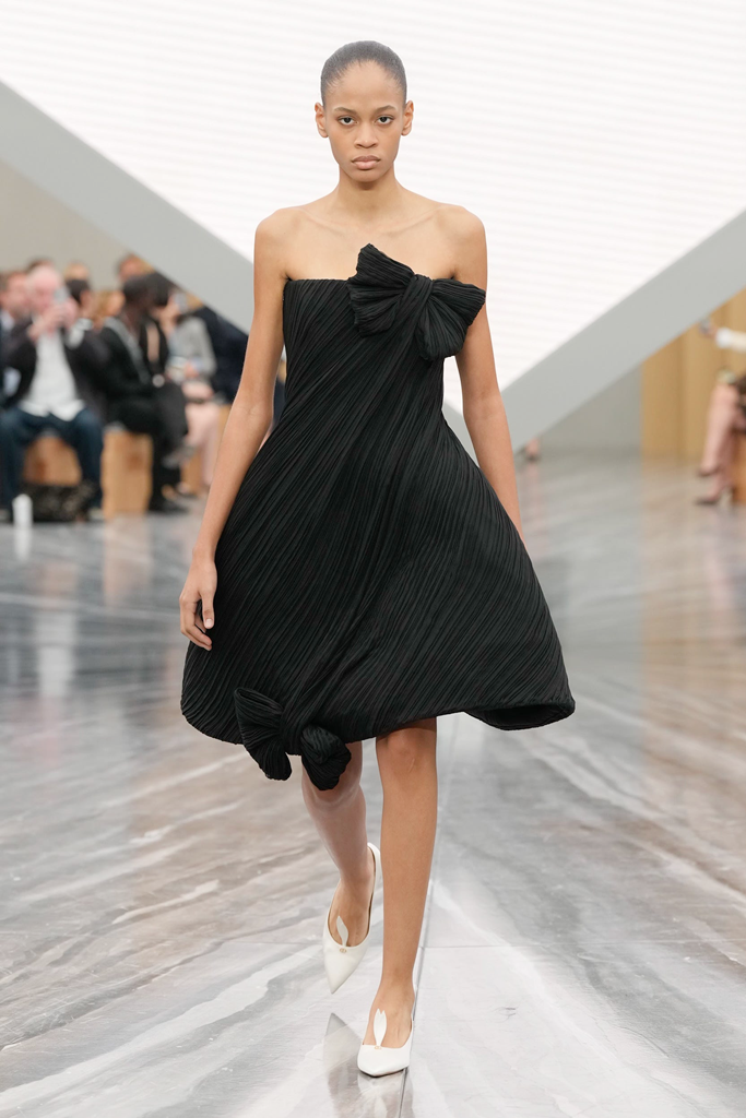 유려한 오프숄더 블랙 가운부터 드라마틱한 프릴로 재해석한 플래드 블라우스까지 유머와 모던함을 더한 대담한 진전으로 평가받았으며 드라마, 로맨스, 그리고 건축이 자연스럽게 조화를 이루는 대화의 장이었다.
