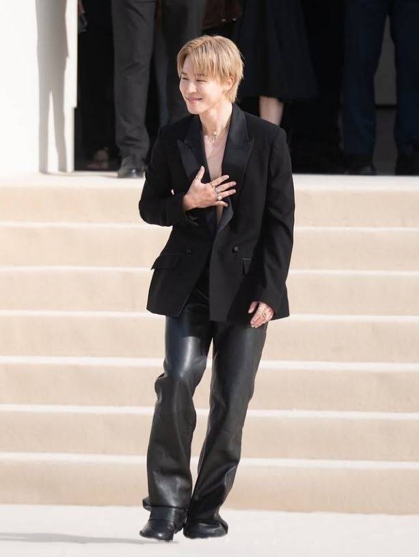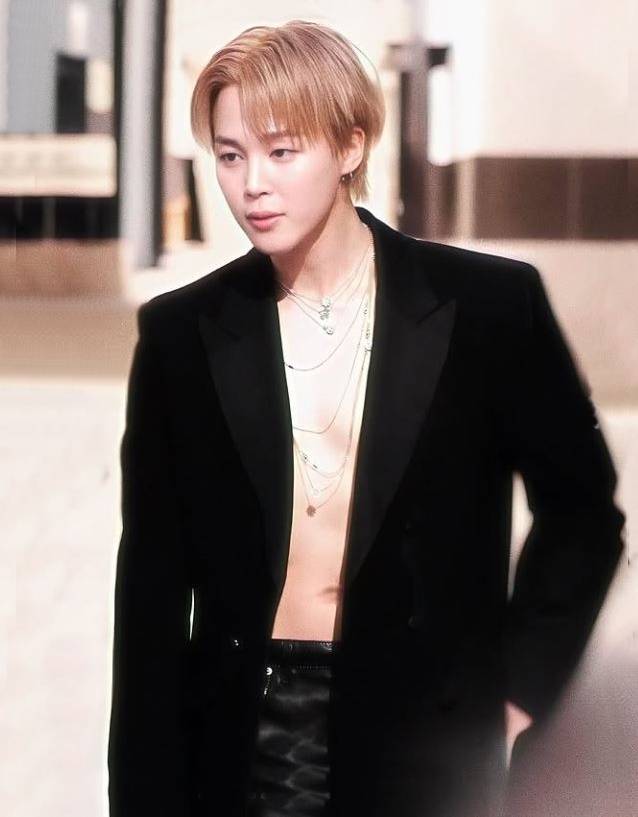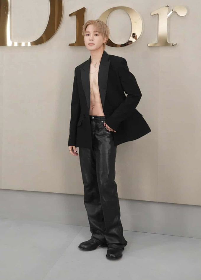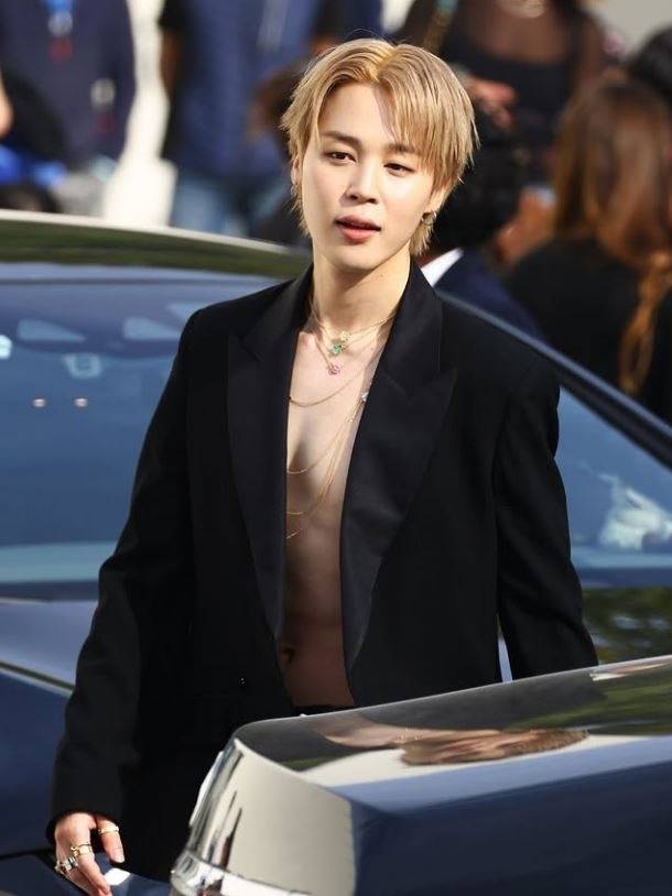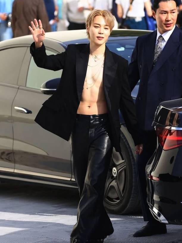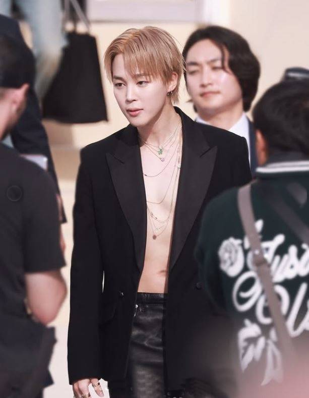 이날 지민은 이너웨어 착용 없이 가슴을 풀어헤친 블랙 슈트룩으로 쇼장에 등장, 수많은 취재진과 팬들의 환호성을 받았다.