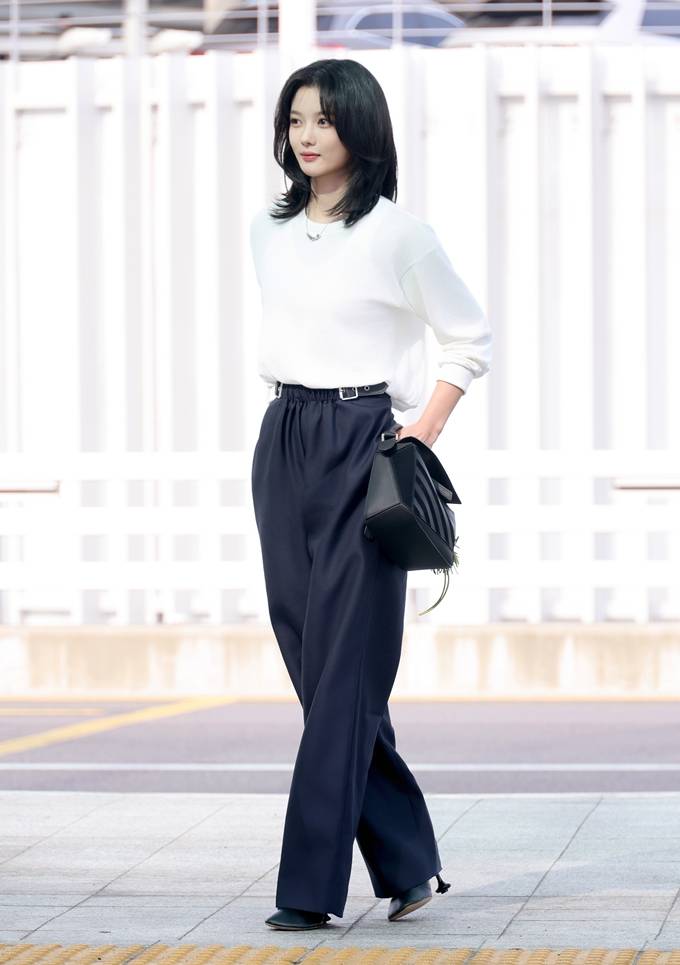 이날 김유정은 군더더기 없는 화이트 니트 톱에 한층 슬림한 실루엣의 네이비 와이드 팬츠를 매치해 깔끔하면서도 절제된 모던룩의 정석을 보여줬다.