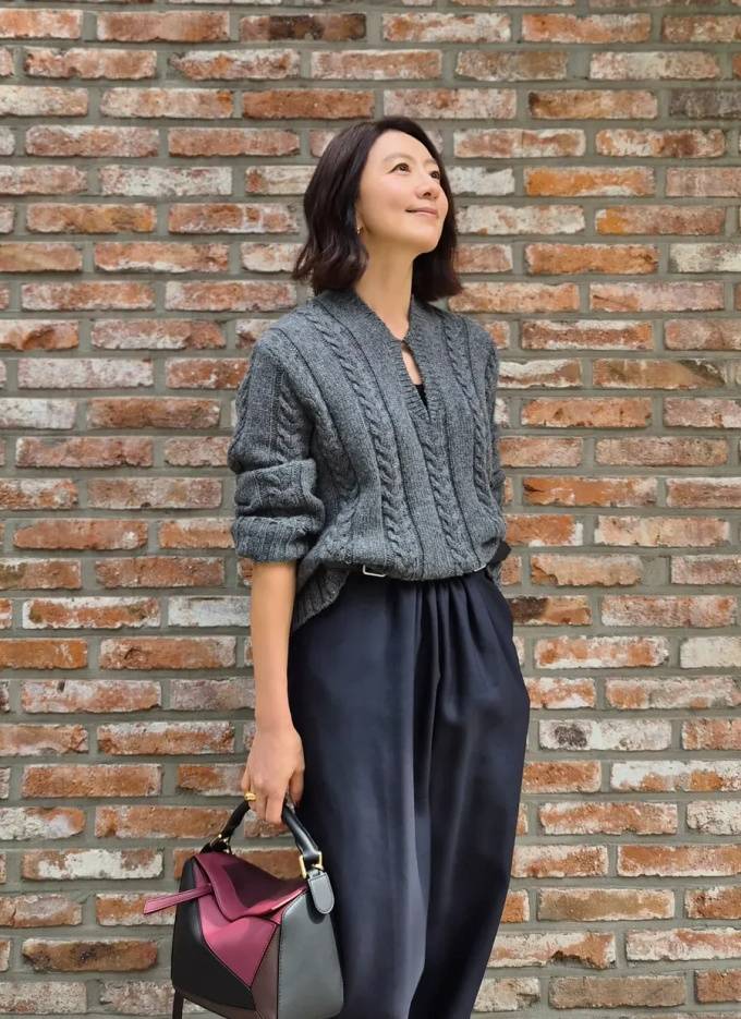 김희애는 짙은 그레이 컬러의 케이블 니트를 루즈하게 착용하고, 여유로운 실루엣의 네이비 팬츠와 매치해 감각적인 꾸안꾸 가을 외출룩을 완성했다.