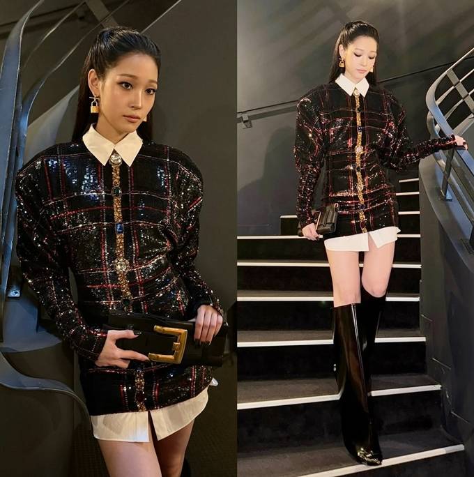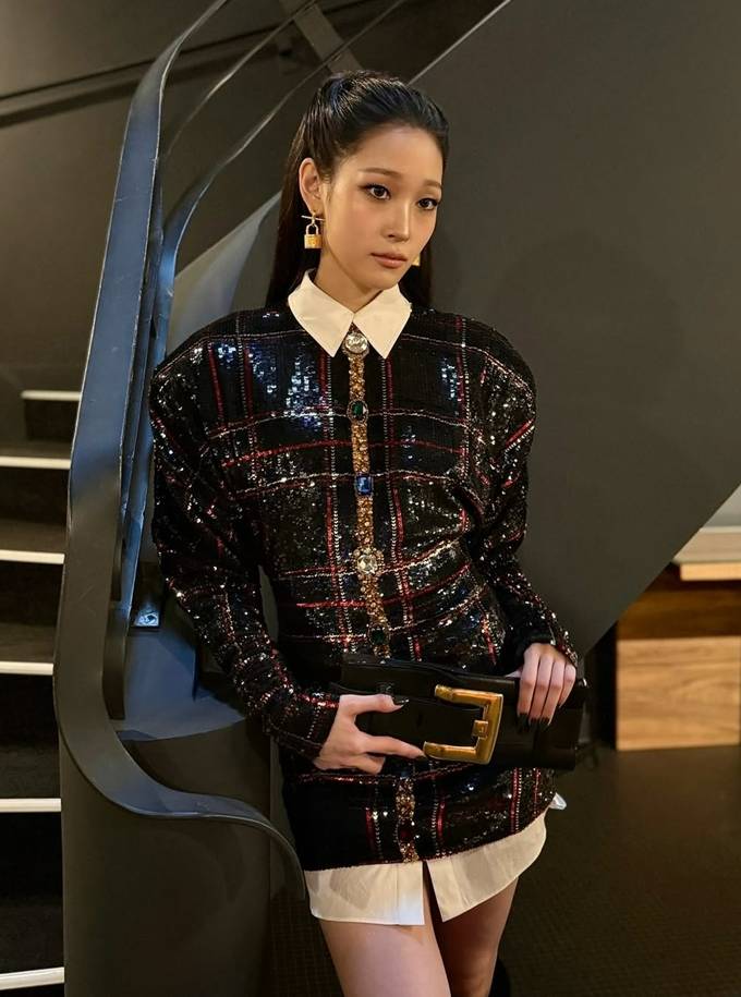 애니는 화려한 주얼 버튼 디테일과 블랙 시퀸 소재에 레드 포인트가 들어간 체크 패턴 셔츠 드레스룩으로 고급스러우면서도 우아한 무드를 연출했다.