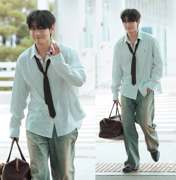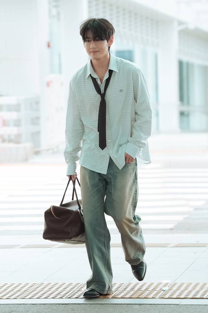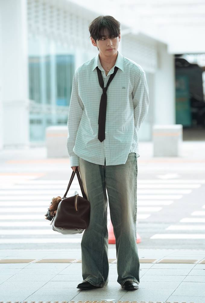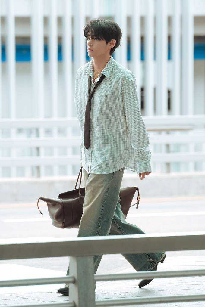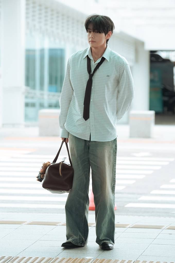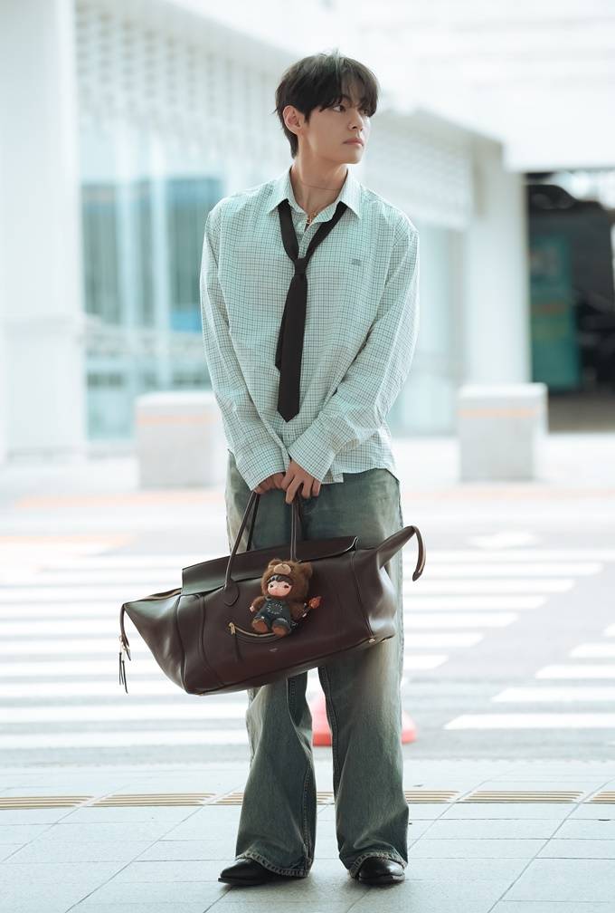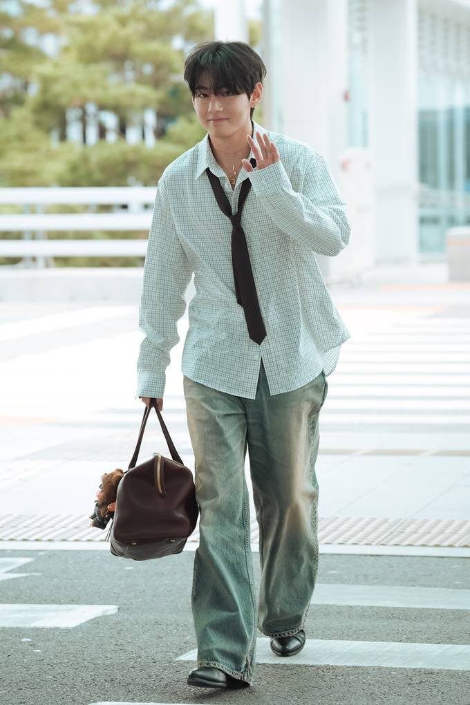 이날 뷔는 넥타이를 느슨하게 한 셔츠와 워싱 데님 팬츠를 매치한 가을 멋남룩으로 공항을 사로잡았다.