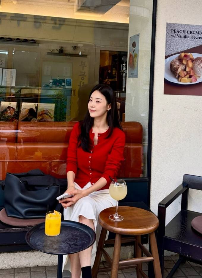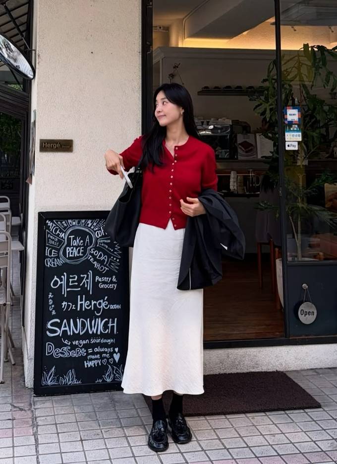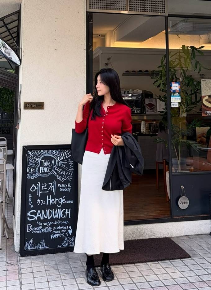 공개한 사진에서 한지혜는 선명한 레드 컬러의 니트 카디건에 단아한 아이보리 롱 스커트를 매치한 외출 데일리룩으로 단아하면서도 고급스러운 무드를 자아냈다.