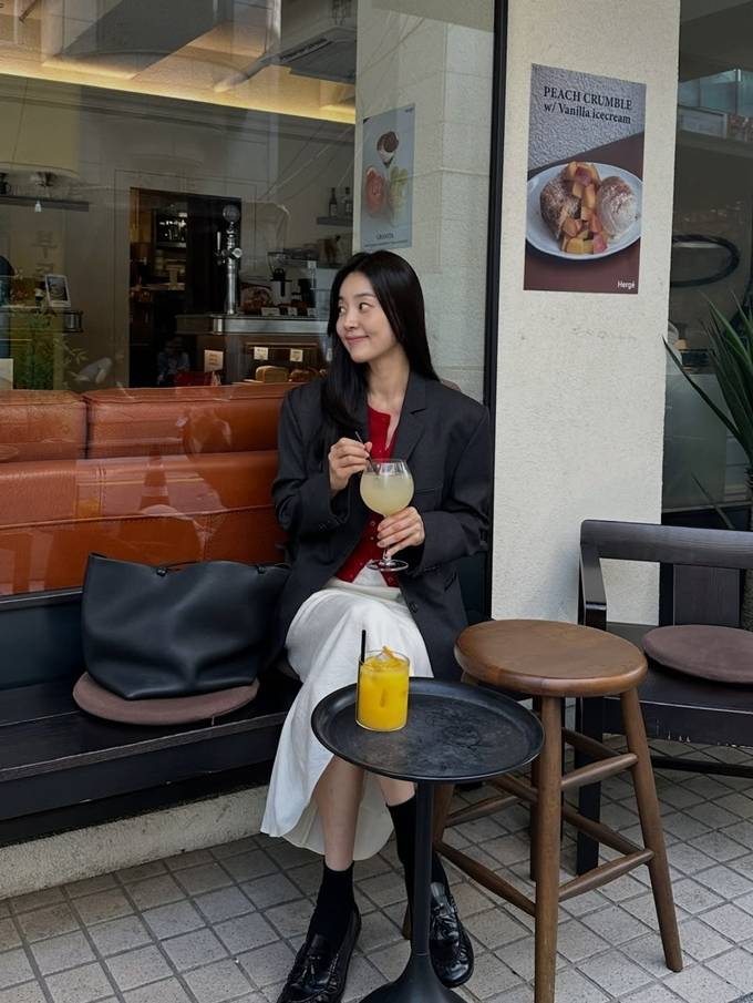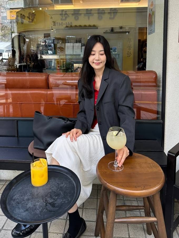한지혜는 과하지 않은 버튼업 스타일로 여성스러운 실루엣을 살리며, 블랙 로퍼와 재킷으로 세련미까지 더해 가을 명절 데일리룩을 완성했다.