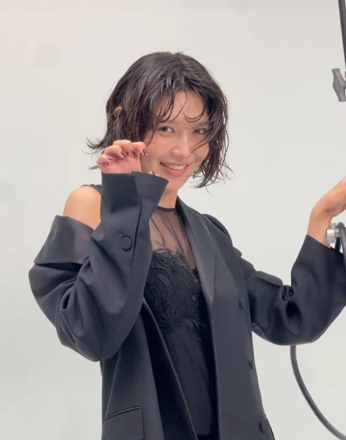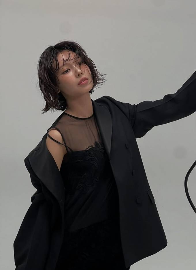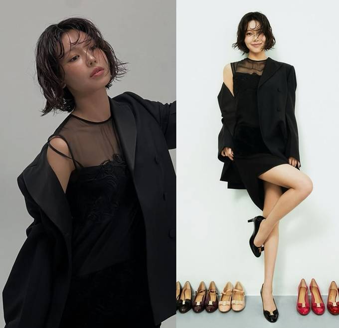 공개한 사진에서 수영은 시스루 블랙 드레스에 오버핏 재킷을 매치해 도회적인 매력을 완성했다.