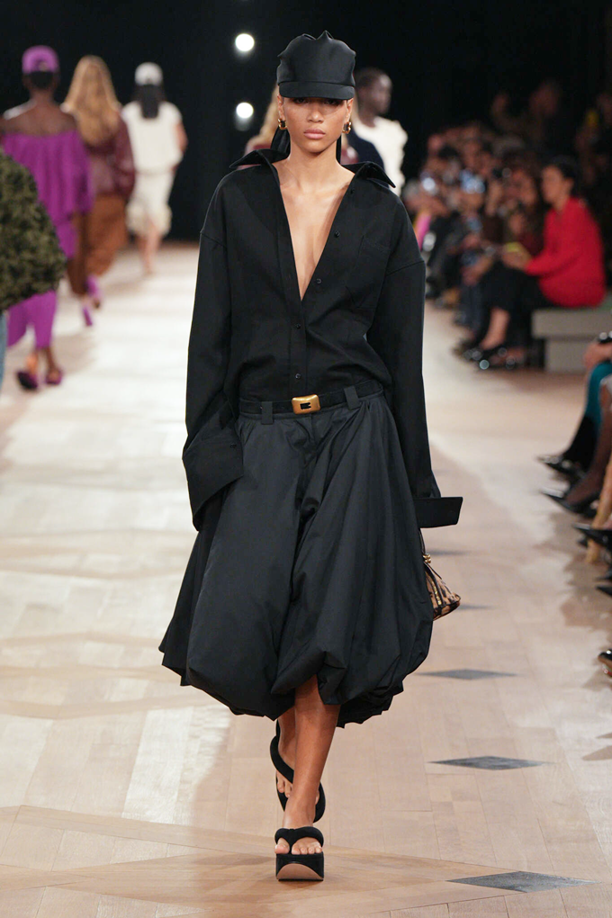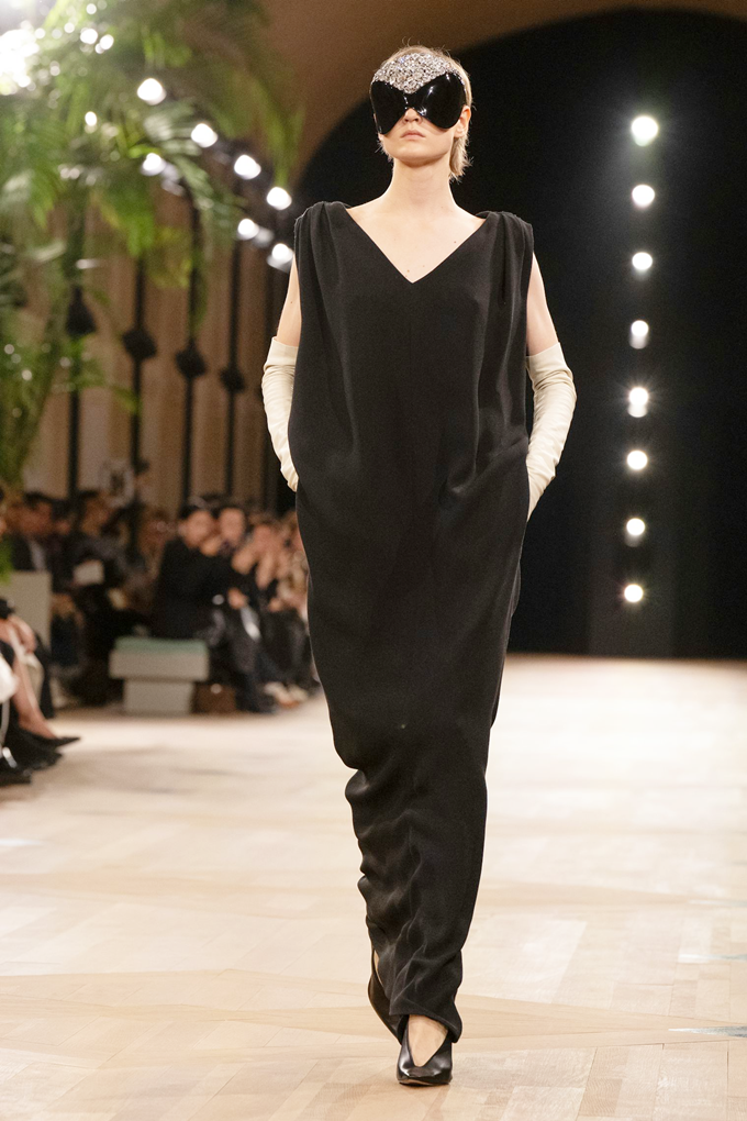 블랙 가운, 오페라 장갑, 거대한 버그아이 선글라스, 그리고 이마를 가린 두툼한 크리스털 장식을 비롯해 첫 번째 룩부터 마지막 스트랩리스 분홍색 가운까지 피치올리의 로맨스와 크리스토발 발렌시아가의 유산을 조화롭게 엮었다.