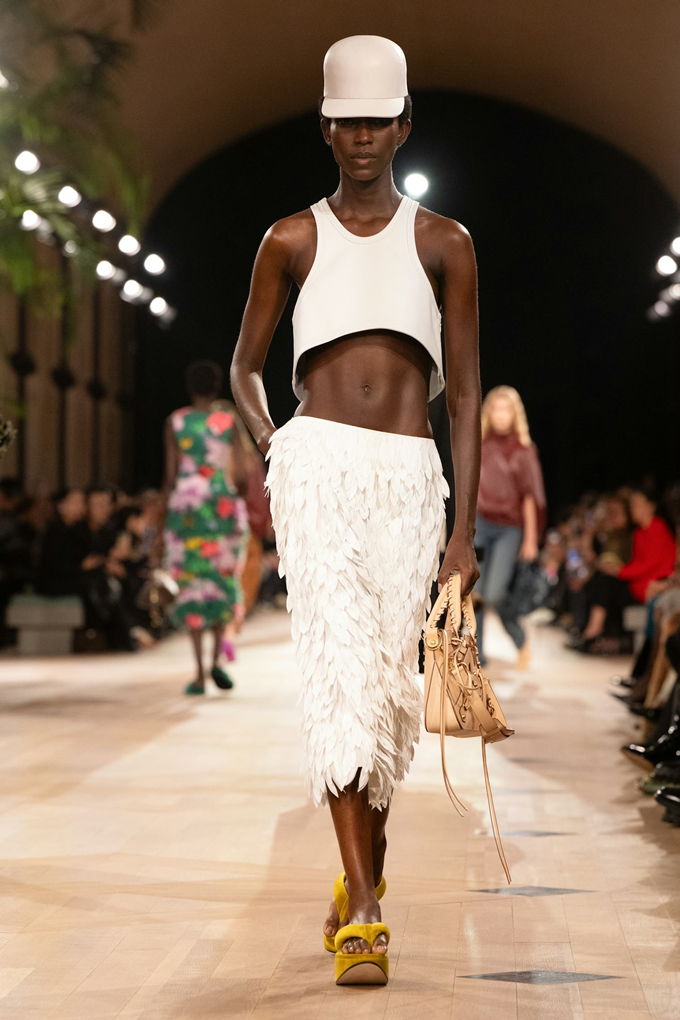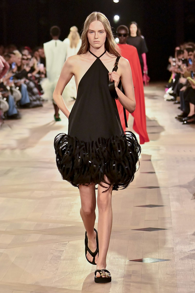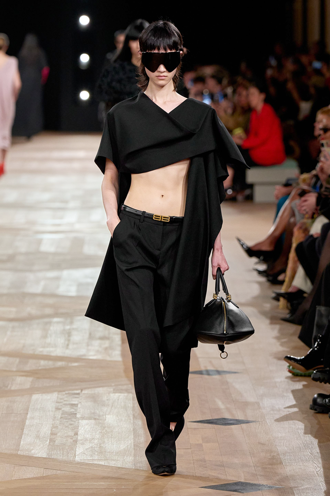 피치올리는 깃털 장식이 돋보이는 하의, 조각 같은 가죽 크롭탑, 프린치 스커트 등 발렌시아가 특유의 건축학적 형태와 기술적 노하우를 선보였다.