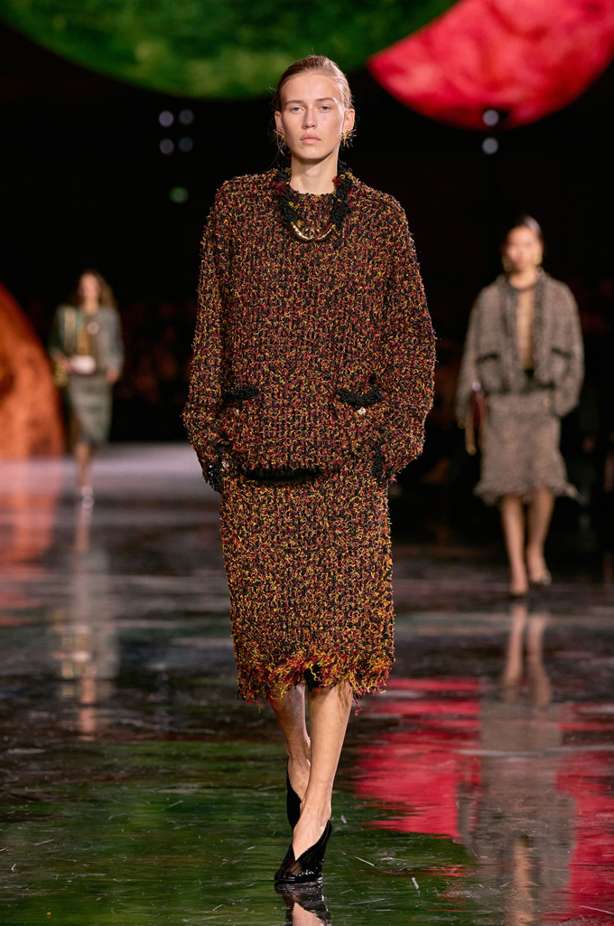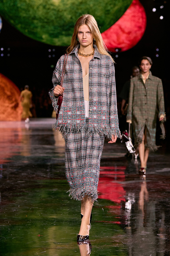 오프닝을 장식한 체크 무늬 팬츠 슈트는 창립자 가브리엘 코코샤넬이 남자친구 아서 보이 카펠의 옷을 빌리던 습관에서 영감을 받았다.