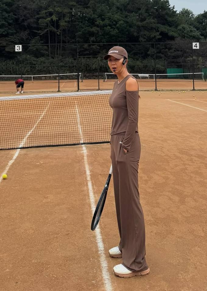 공개한 사진에서 전미라는 브라운 톤의 숄더 컷아웃 상의와 와이드 팬츠를 매치한 톤온톤 스타일로 일상복 같은 스타일리시한 테니스룩을 선보였다.