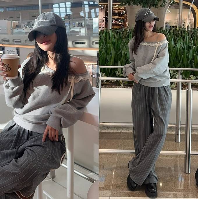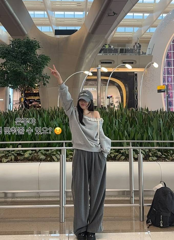 공개한 사진에서 이솔이는 한쪽 어깨가 드러난 그레이 컬러의 오프숄더 맨투맨에 핀스트라이프 와이드 팬츠를 매치한 꾸안꾸 여행룩으로 여유로우면서도 설렘 가득한 분위기를 자아냈다.