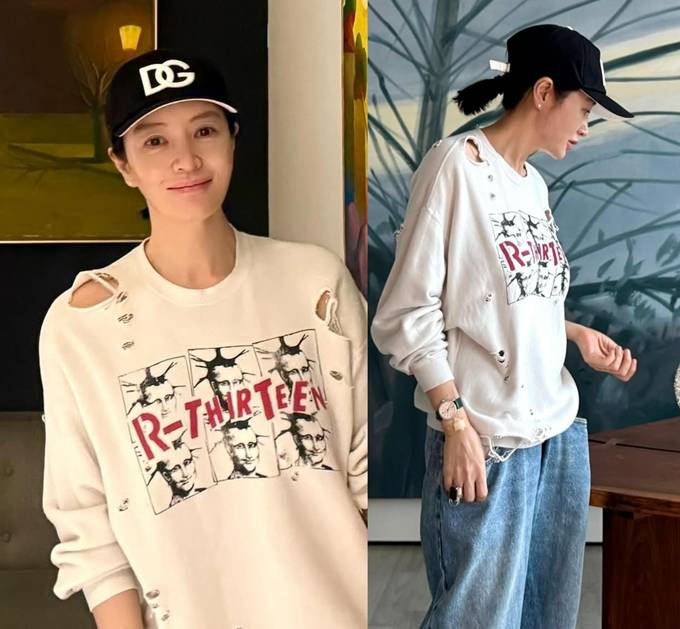 김혜수, 구멍마저 예술! 구멍 숭숭 디스트로이드 맨투맨과 데님 꿀조합 빈티지 레이어드룩