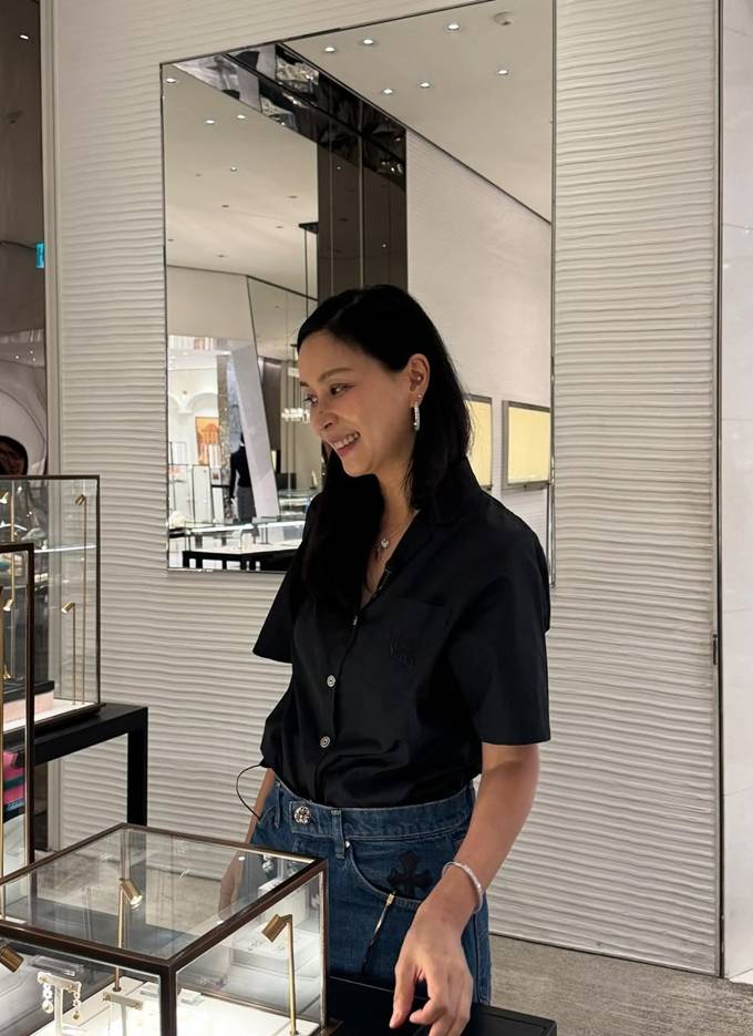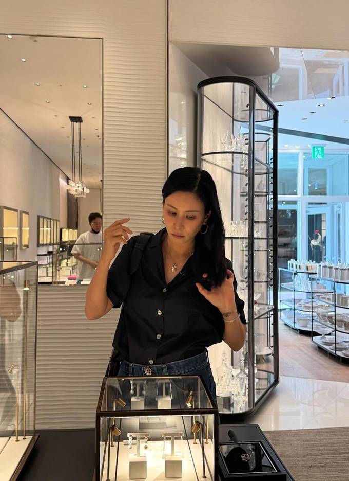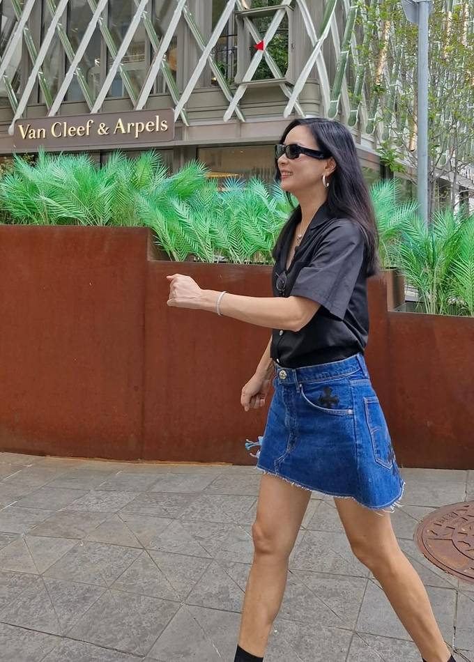 여기에 깔끔한 실버 주얼리와 블랙 선글라스로 포인트를 더하며, 여전히 모델 못지않은 비율과 동안 미모를 자랑했다.