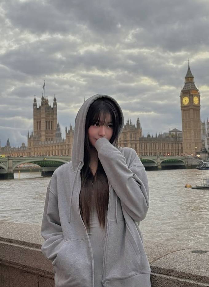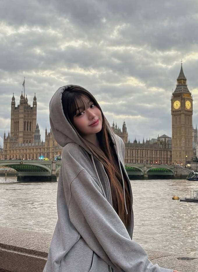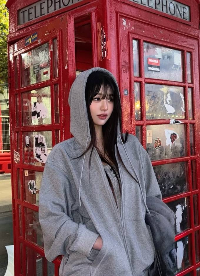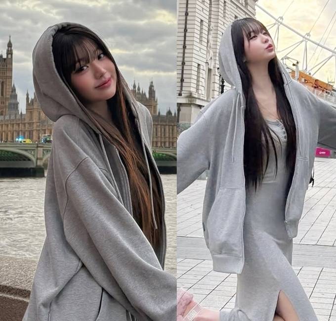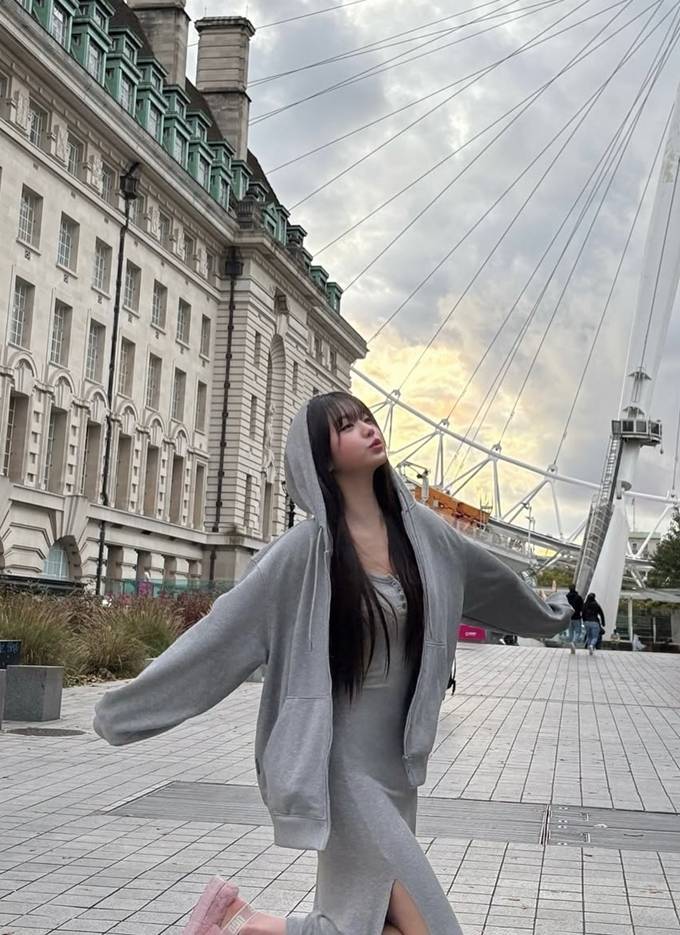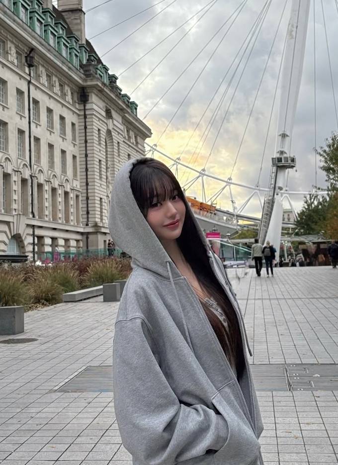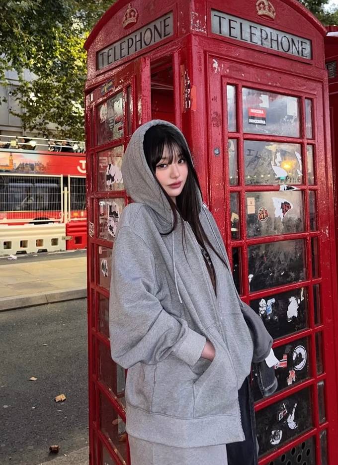 그룹 아이브의 장원영이 런던에서 오버핏 후드 집업 스웻셔츠로 자유로운 휴식 타임을 즐겼다.