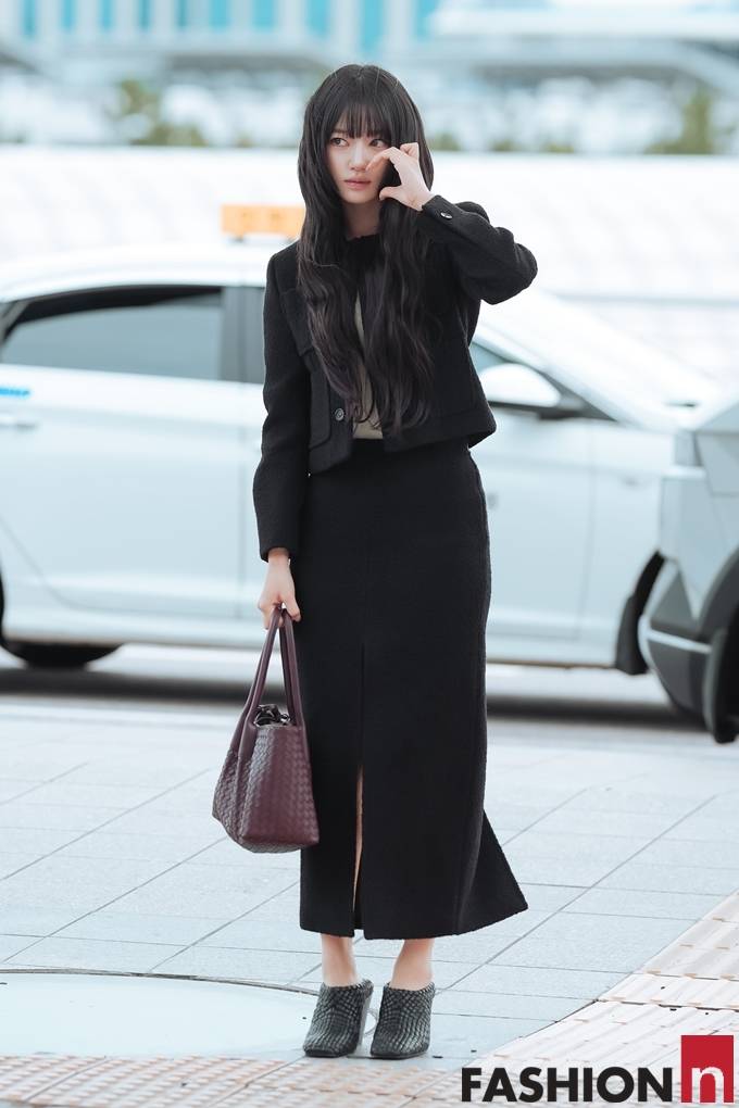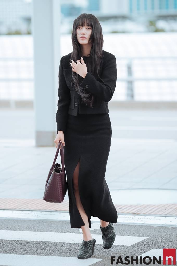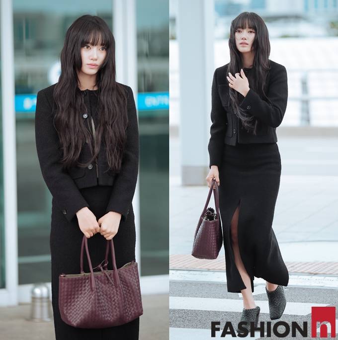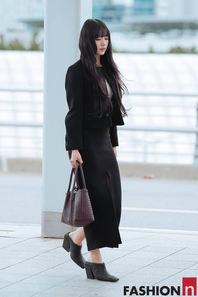 [패션엔 포토] 미야오 수인, 공항이 발칵! 단정함 속 은근 섹시미 올 블랙 앞트임 투피스룩