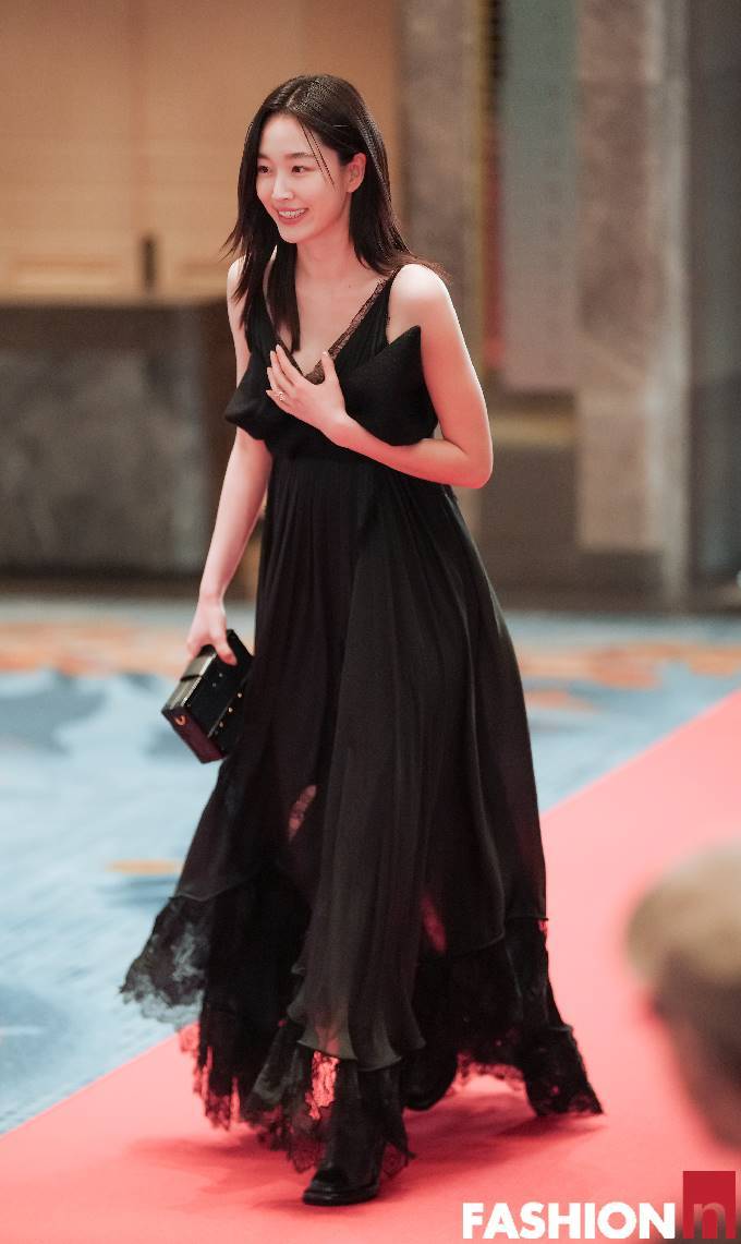 이날 원지안은 깊은 브이넥 라인과 비대칭 헴라인, 풍성한 러플 디테일이 돋보이는 블랙 레이스 드레스룩으로 우아하면서도 미스터리한 분위기의 고혹미를 드러냈다.