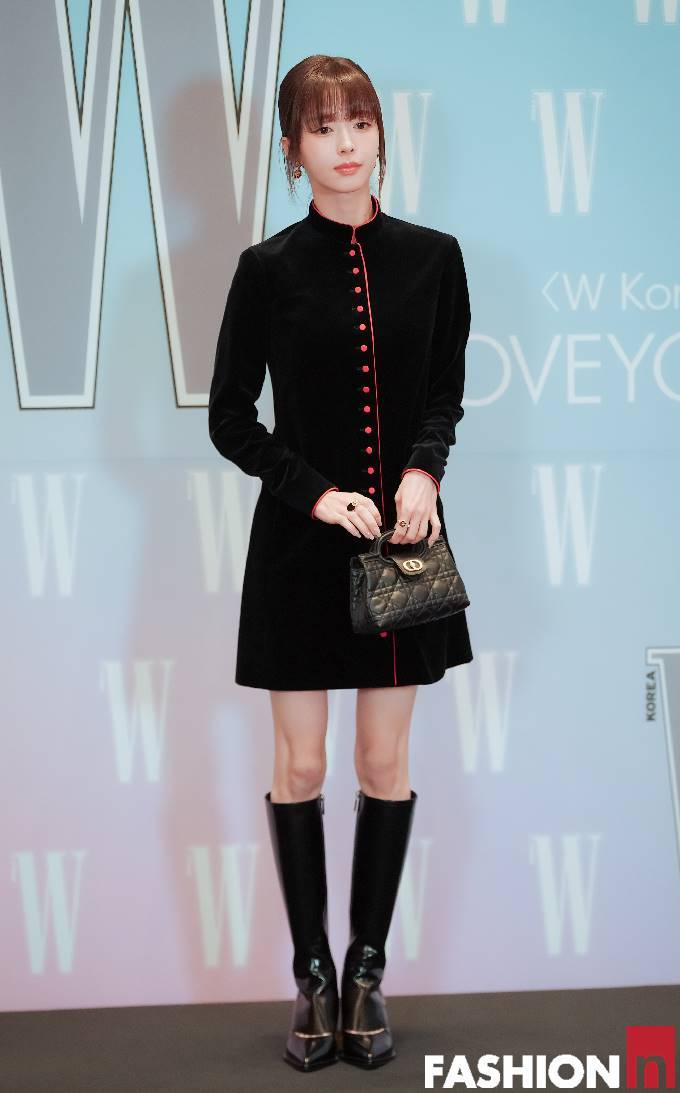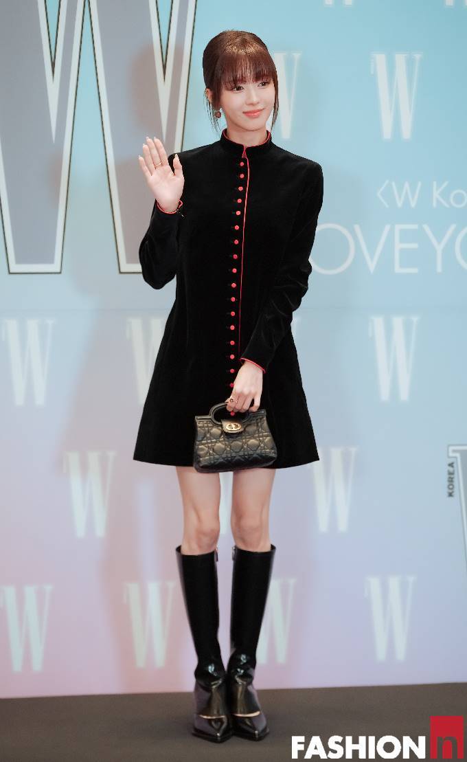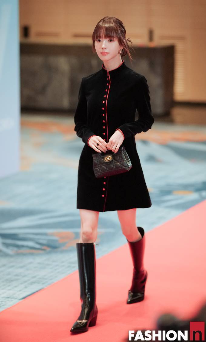 이날 행사에서 노정의는 레드 버튼 디테일이 더해진 블랙 벨벳 소재의 하이넥 미니 드레스룩으로 독보적인 인형 미모를 뽐냈다.
