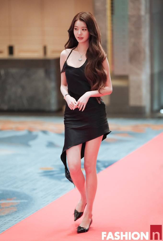 이날 장원영은 비대칭 비율의 하늘하늘한 블랙 슬립 드레스룩으로 섹시한 자태를 뽐냈다.