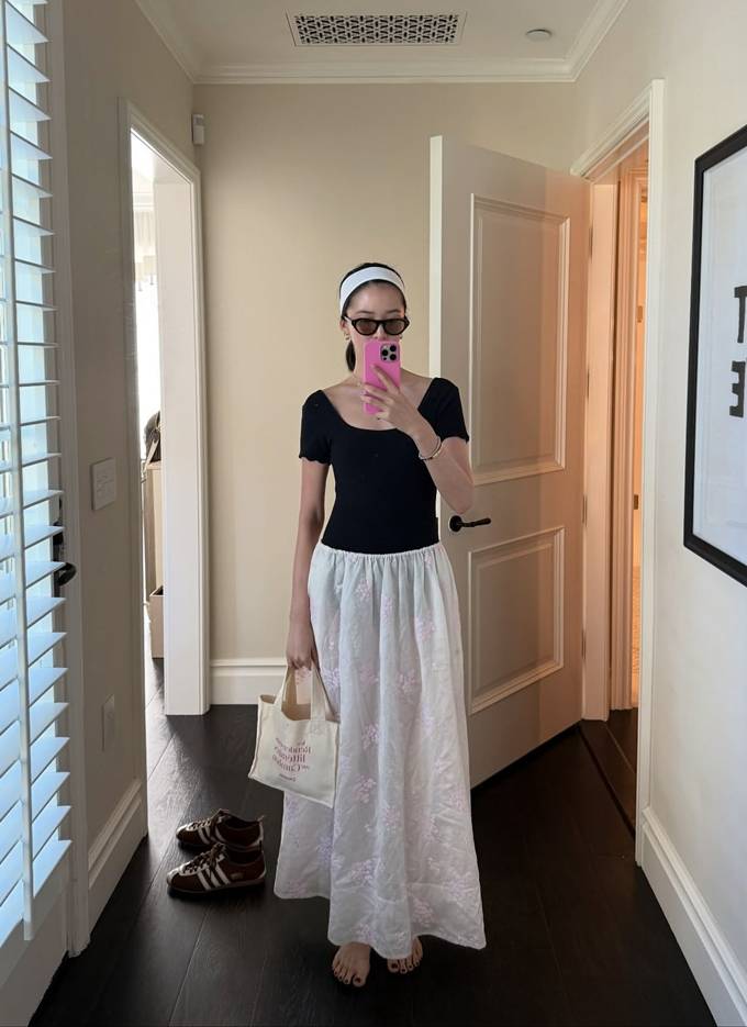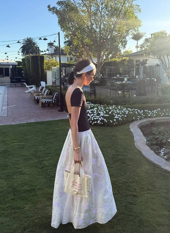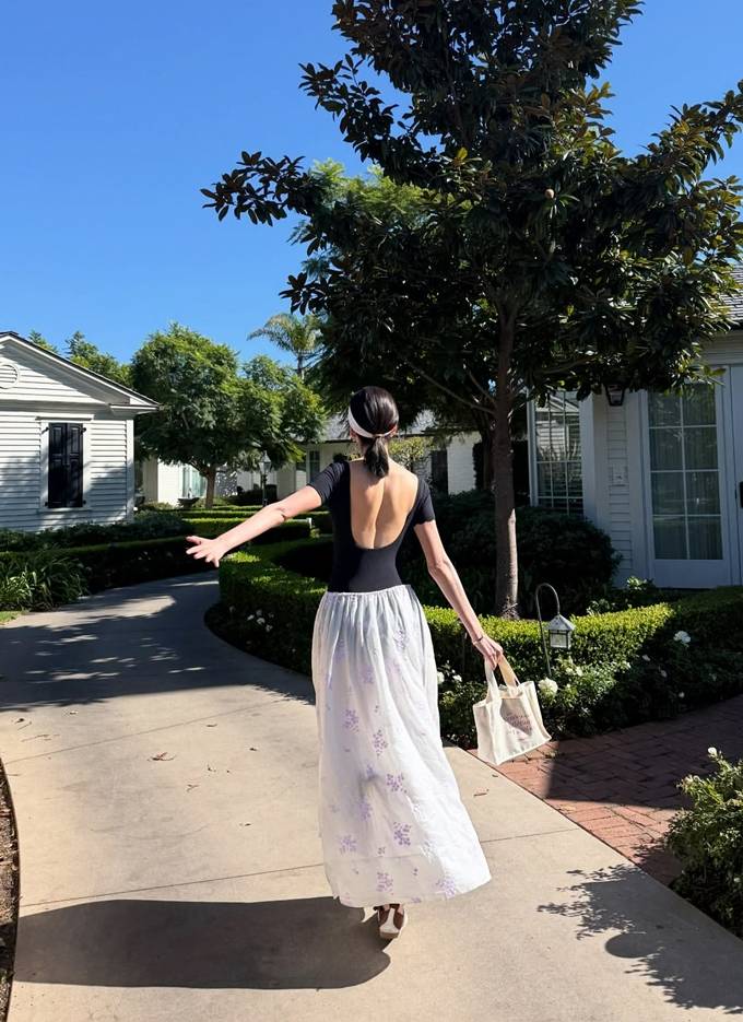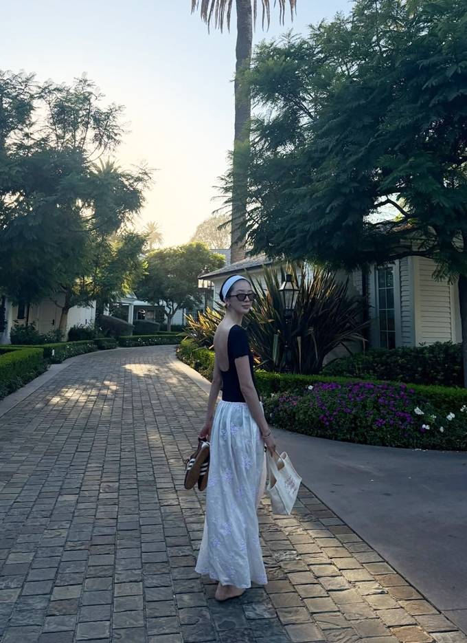 공개한 사진에서 아이린은 딥 네이비 톤의 스퀘어넥 바디슈트에 라벤더 자수가 은은하게 들어간 화이트 롱 스커트를 매치한 리조트룩으로 클래식하면서도 우아한 실루엣을 선보였다.