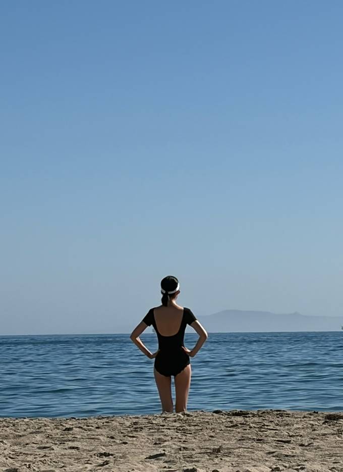 특히 등이 시원하게 파인 백라인 디자인이 뒷모습까지 시선을 사로잡으며, 자연스러운 리조트 무드를 더했다.