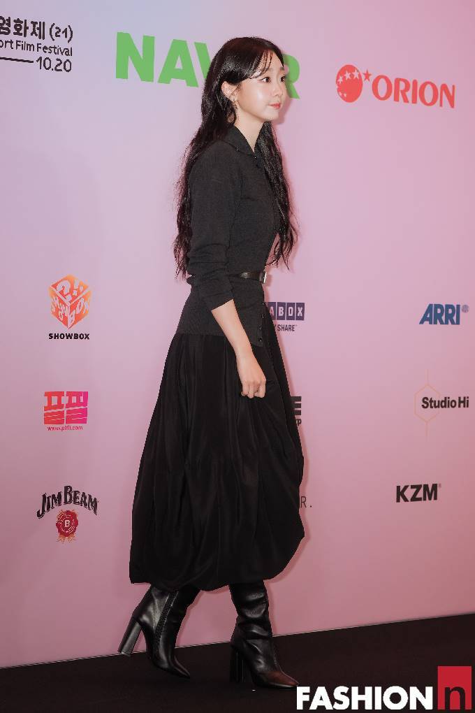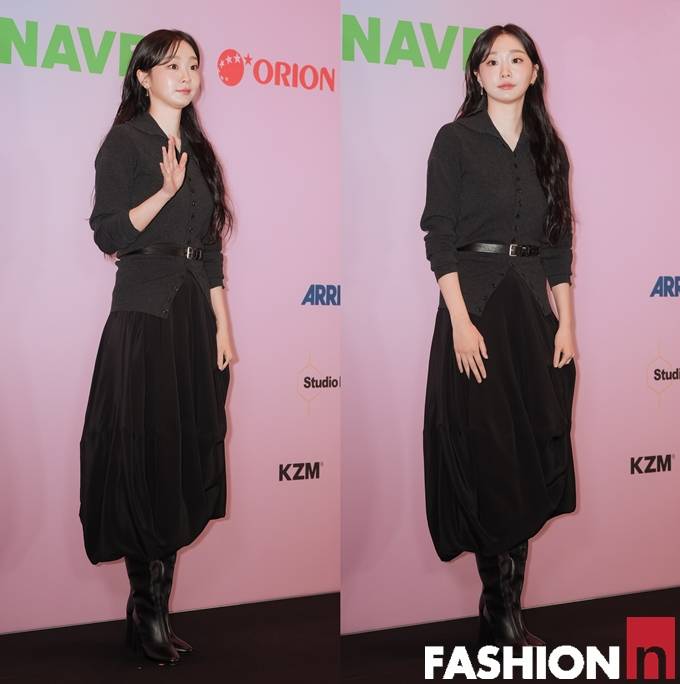 이날 김다미는 단정한 카라 니트 톱에 볼륨감 있는 벌룬 스커트를 매치해 모던하면서도 구조적인 올 블랙 프렌치 시크룩을 완성했다.