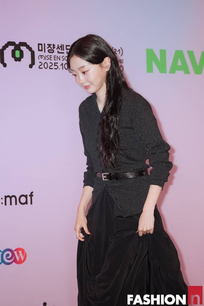 특히 허리를 강조한 벨트 포인트로 날씬한 라인을 연출했으며, 무릎 위까지 올라오는 블랙 부츠로 강렬한 존재감을 더했다.
