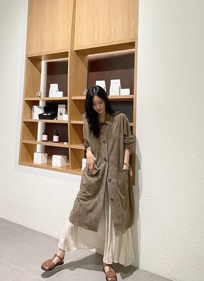 김소연, 스웨이드 롱 코트의 분위기 여신! 맥시 스커트와 꿀조합 감성 코트룩