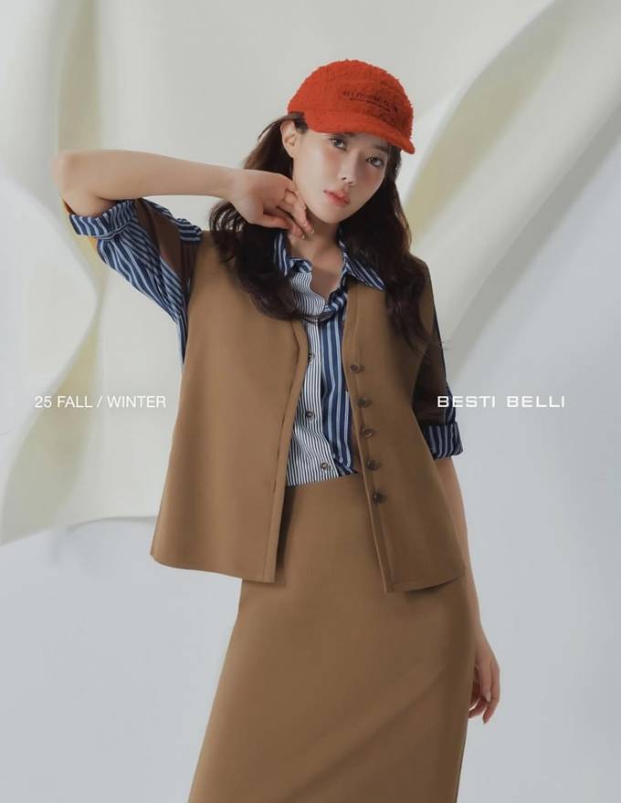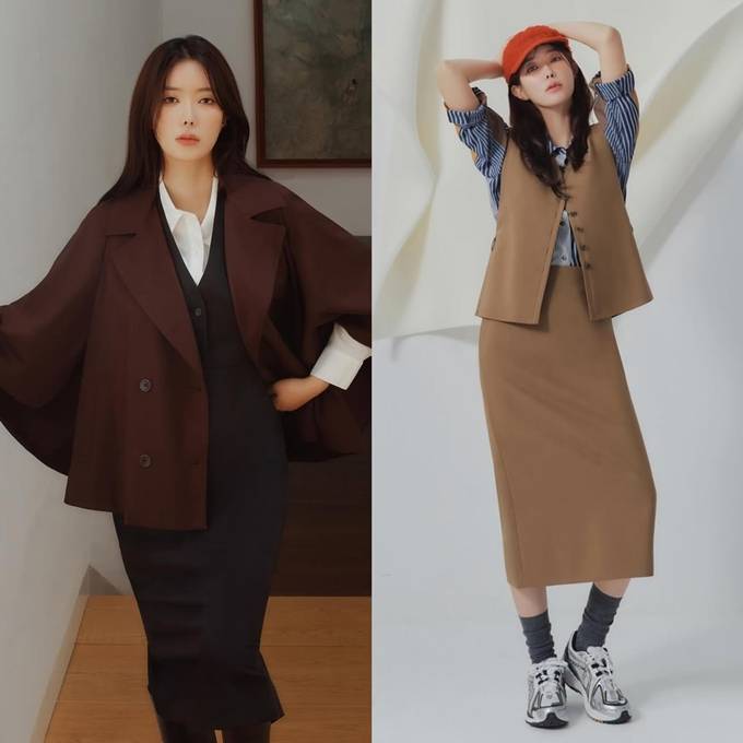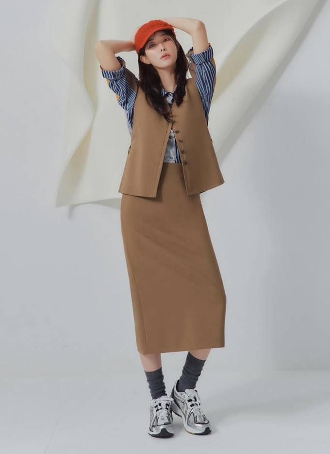 또 다른 컷에서는 카멜톤 베스트와 H라인 스커트 세트업에 스트라이프 셔츠, 오렌지 컬러 캡을 더해 한층 경쾌한 매력을 선보였다. 특히 스니커즈와 양말을 더한 믹스매치 스타일링으로, 포멀함 속 자유로운 감성을 완벽히 표현했다.