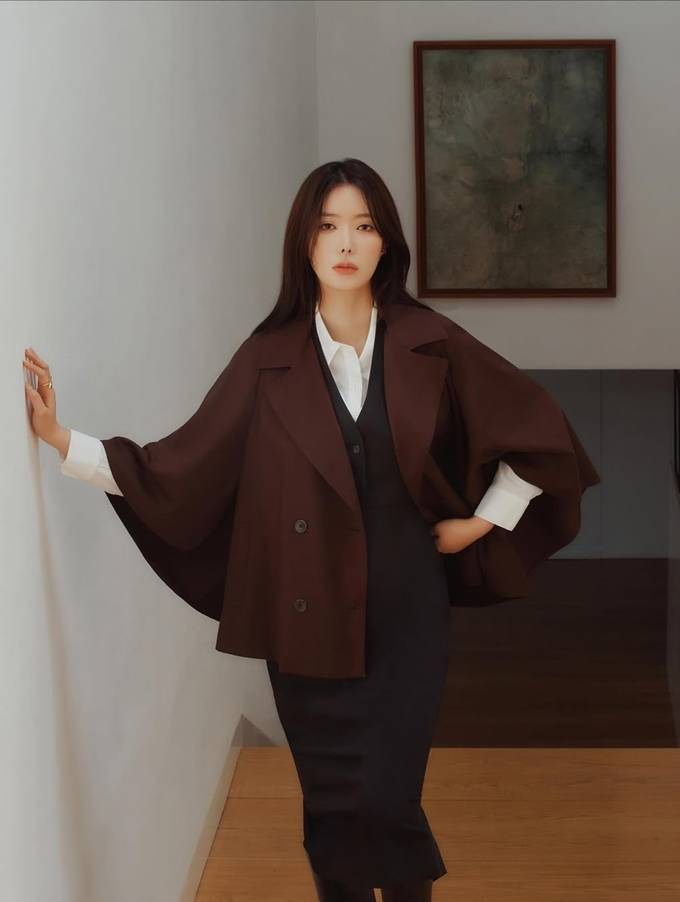 공개한 화보에서 임수향은 딥브라운 컬러의 케이프 재킷과 블랙 원피스를 매치해 고급스러운 무드를 완성했다.
