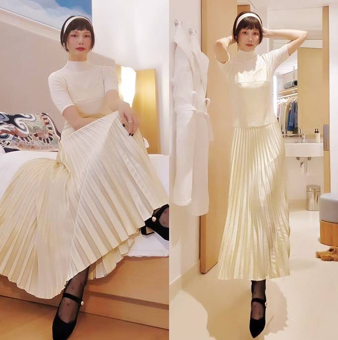 또한 블랙 메리제인 힐과 도트 시스루 스타킹, 그리고 화이트 헤어밴드 포인트로 클래식한 무드를 완성했다.