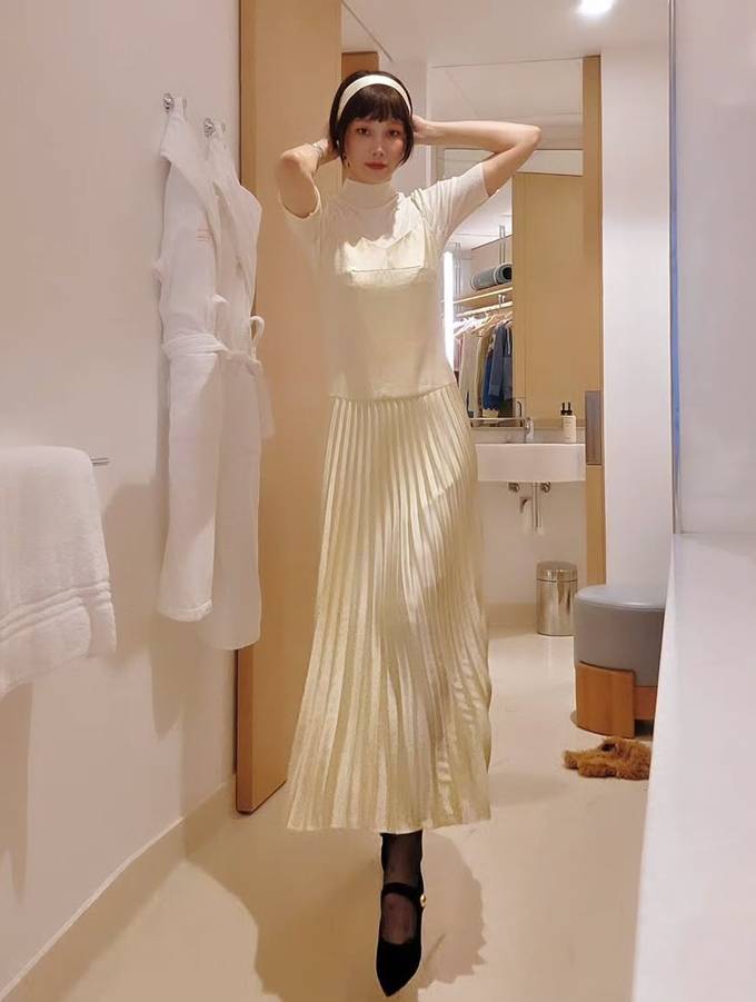 송경아, 알고도 놀라는 기럭지! 플리츠 스커트로 끝낸 황금비율 하이웨이스트 룩