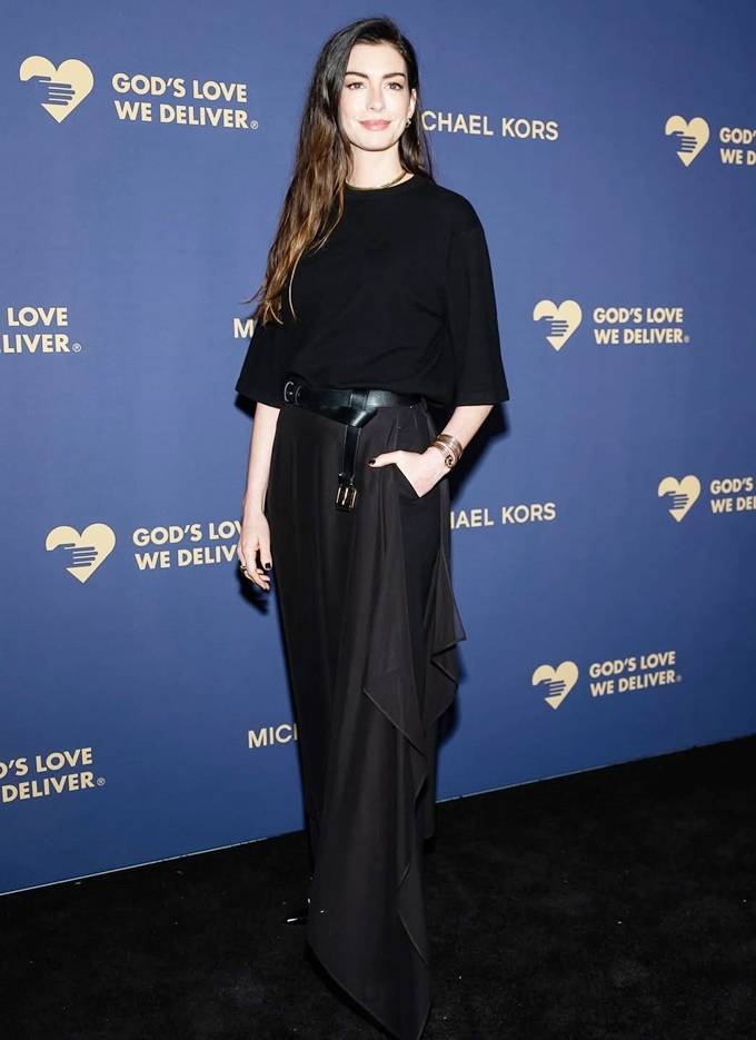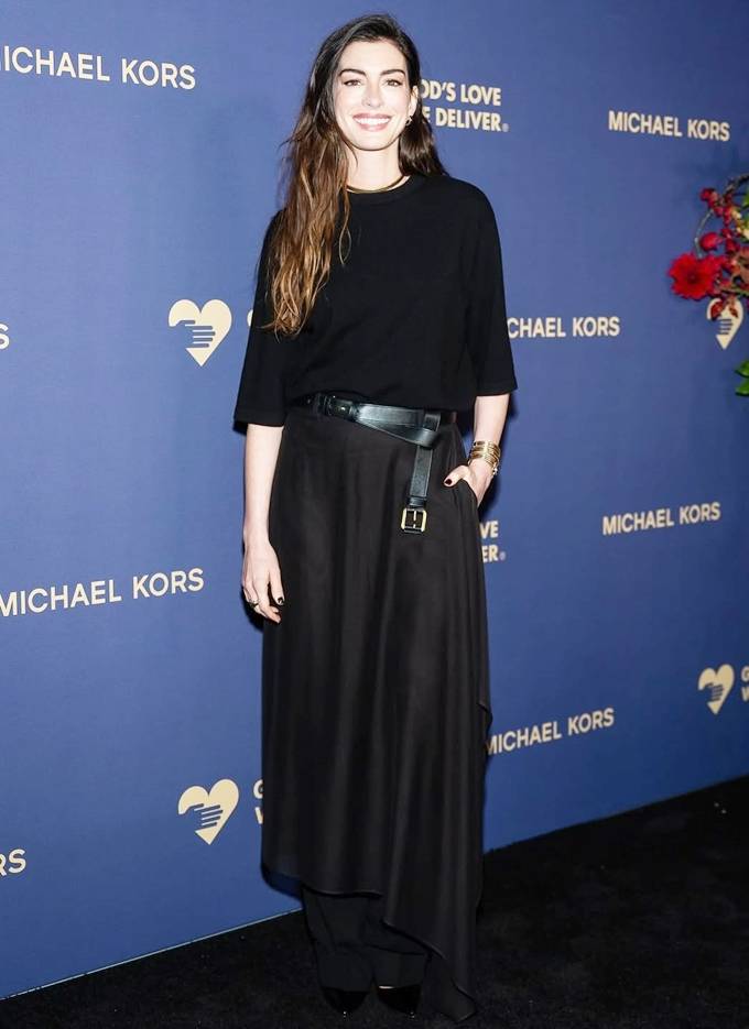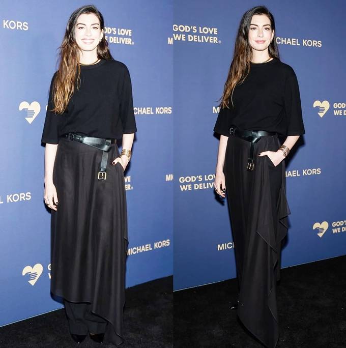 공개한 사진에서 앤 해서웨이는 루즈한 블랙 톱에 블랙 팬츠 위에 비대칭 실루엣의 롱 스커트를 입고, 볼드한 버클 벨트로 포인트를 준 레드카펫룩으로 시크하면서도 세련된 스타일을 완성했다.