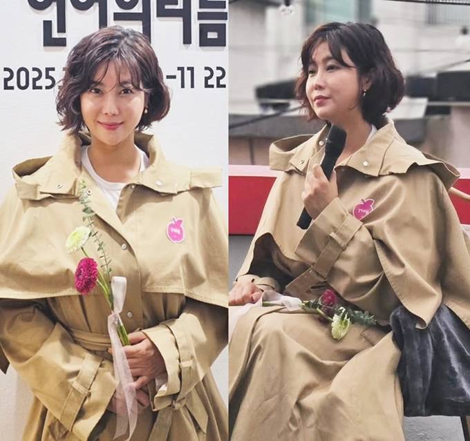 넓은 숄카라와 벨트 디테일이 더해진 코트는 클래식한 분위기를 자아내며 토크쇼에서 존재감을 발산했다.
