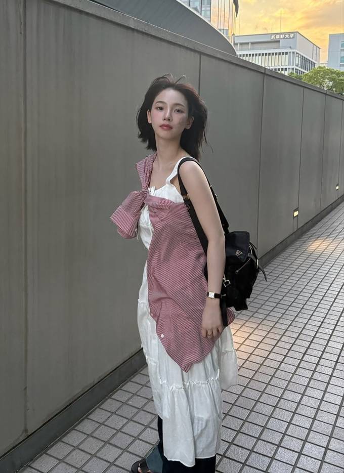 특히 스모크 밴딩 디테일이 허리를 슬림하게 잡아주며, 자연스럽게 퍼지는 실루엣이 로맨틱한 분위기를 연출했다.
