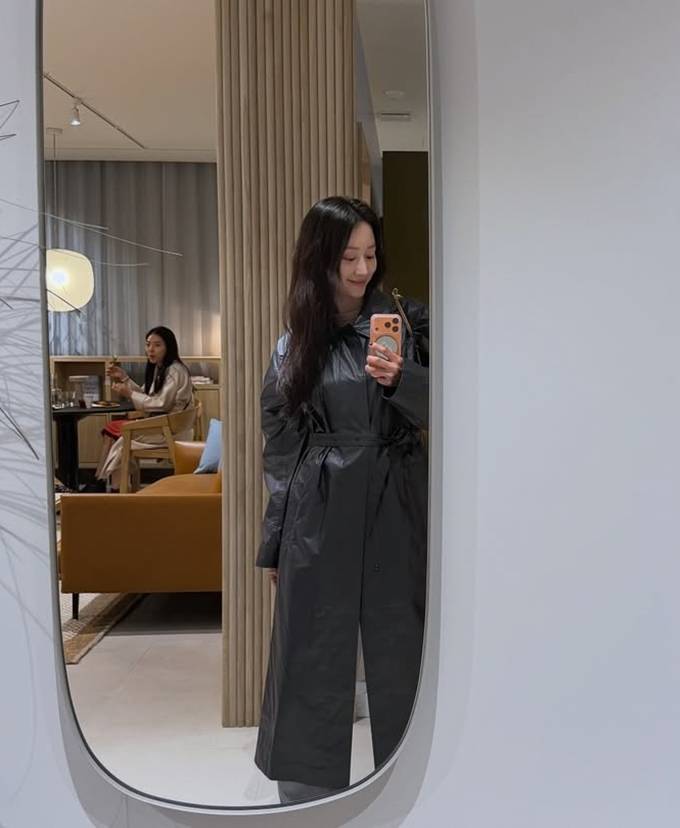 전혜빈, 북유럽 가구 매장에서 휘게 감성 제대로! 가죽 벨티드 실루엣 트렌치코트룩