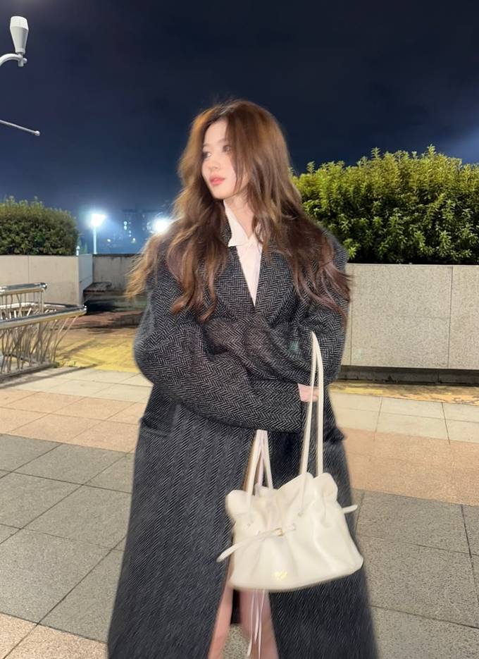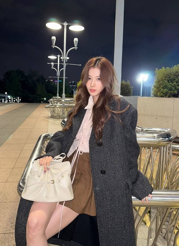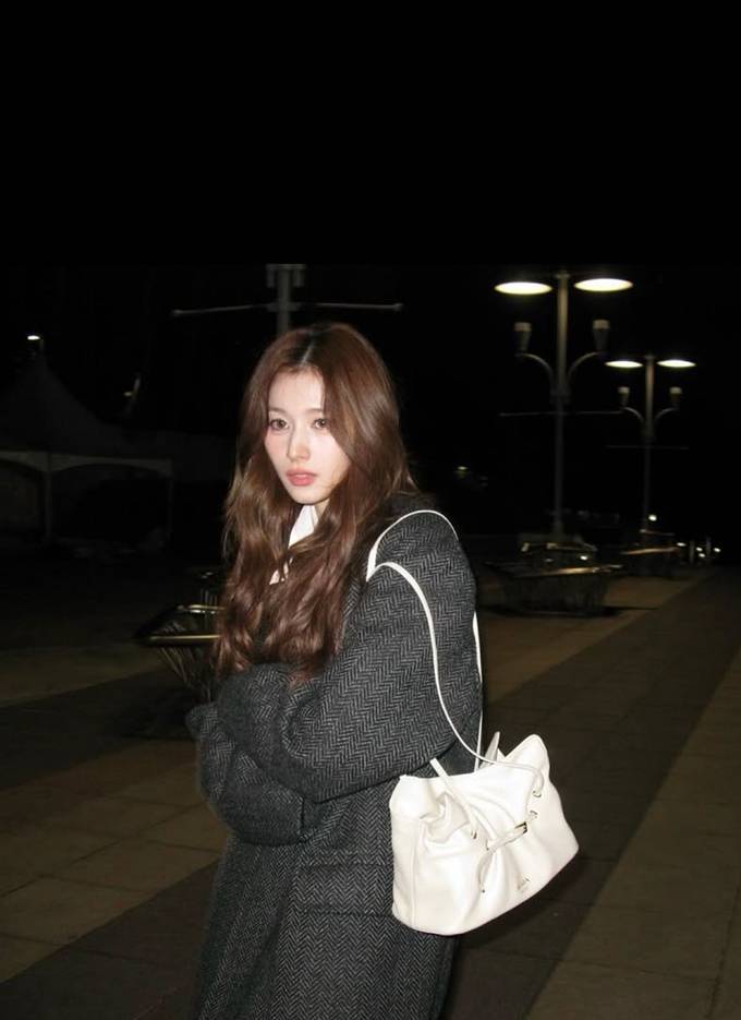 공개한 사진에서 사나는 헤링본 덱스처의 묵직한 그레이 컬러의 롱 코트를 걸치고 따뜻하면서도 세련된 밤 외출룩의 정석을 선보였다.
