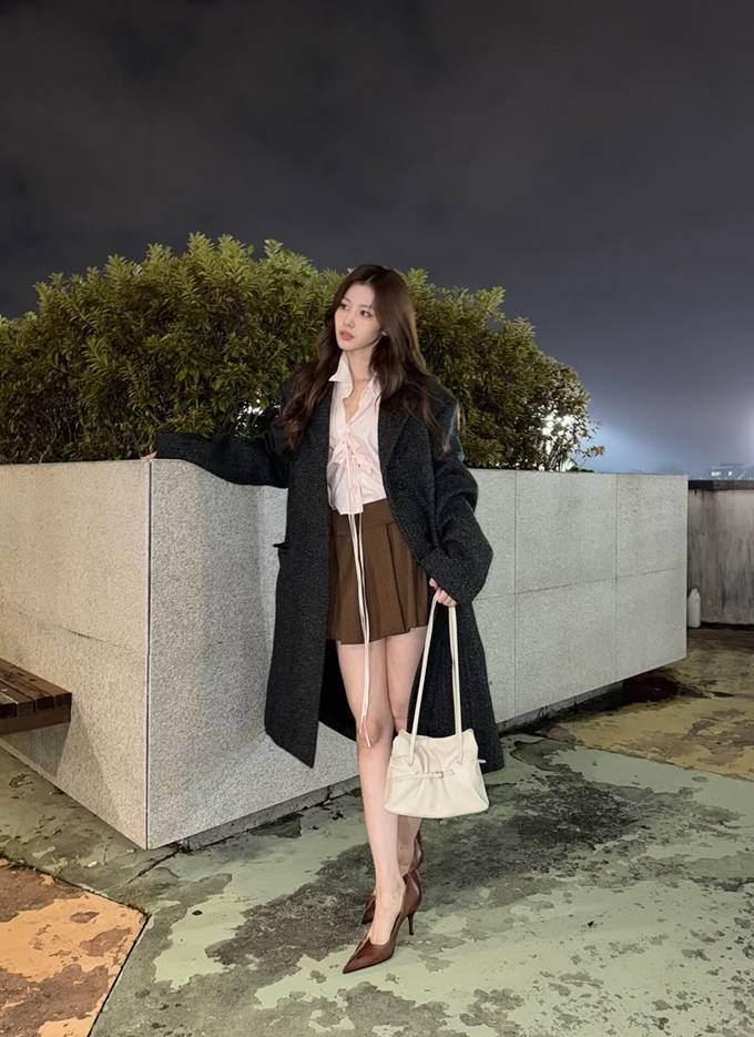 이너로는 연핑크 리본 블라우스에 브라운 미니 스커트를 매치해 로맨틱한 무드를 더했고, 여기에 크림색 숄더백과 브라운 힐로 포인트를 줘 고급스러움을 더했다.