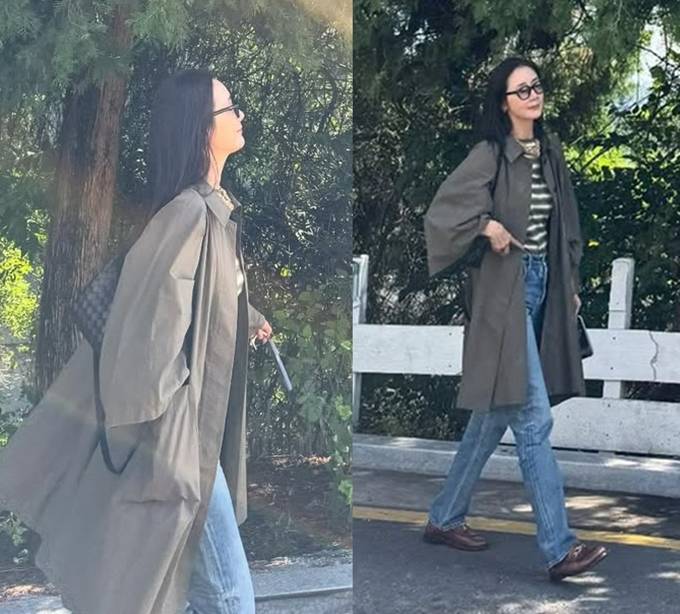 배우 최지우가 가을 햇살 아래 여유로운 실루엣의 트렌치코트룩으로 가을 외출을 즐겼다.