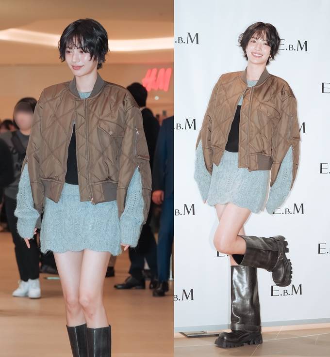 이날 나나는 케이트 니트 투피스와 경량 퀼팅 봄버을 레이어드한 러블리한 윈터룩으로 9등신 바율의 눈부신 각선미를 뽐냈다.