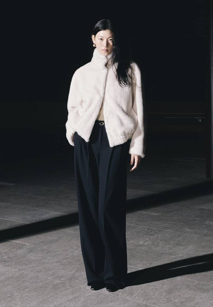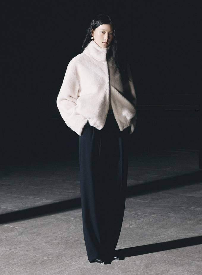 드롭 숄더의 편안함과 세련된 컬러톤이 돋보이는 무스탕 재킷으로 데님 팬츠와 매치하면 스타일리시한 윈터룩, 스커트와 매치하면 포근한 데일리 오피스룩으로 변신한다.