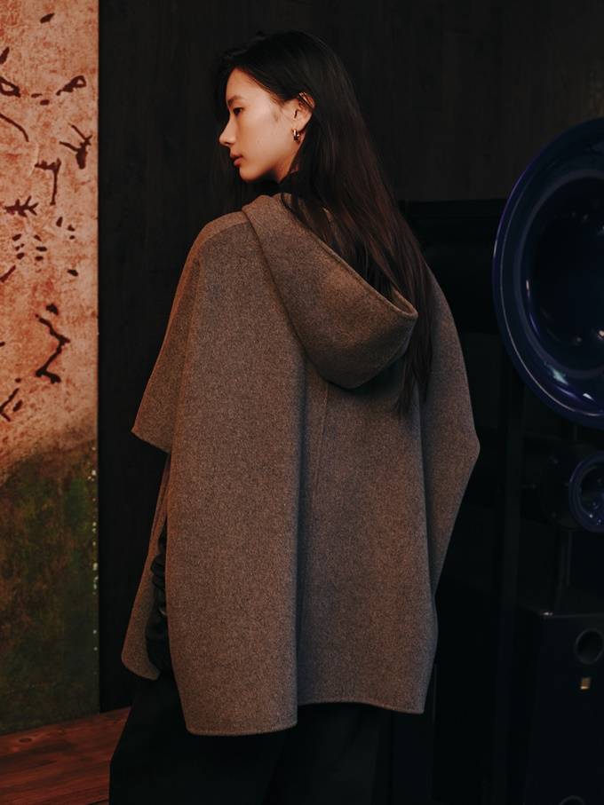 '쉬즈미스' 후드 케이프 재킷은 간결한 실루엣과 부드러운 터치감이 돋보이는 하프 슬리브 코트로 보온성과 활동성을 동시에 갖췄다.