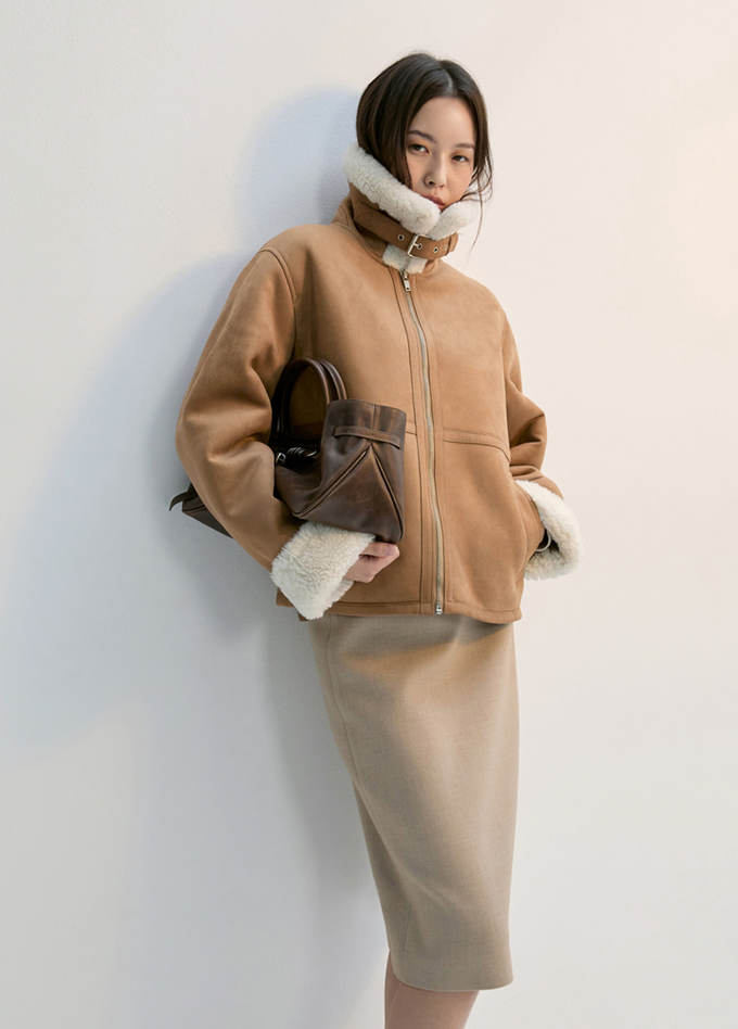 모던 컨템포러리 브랜드 '쉬즈미스'의 하이넥 무스탕 재킷은 부드러운 스웨이드 텍스처와 보아 퍼 안감을 결합한 무톤 재킷으로 캐주얼 및 세미 포멀룩 연출에 제격이다.