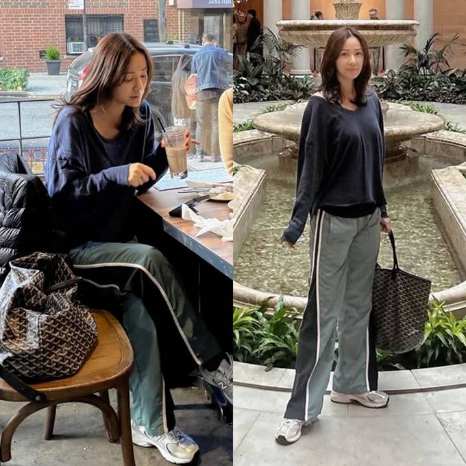 배우 손태영이 뉴욕에서 트레이닝 팬츠 애슬레저룩으로 꾸안꾸 미모를 발산했다.