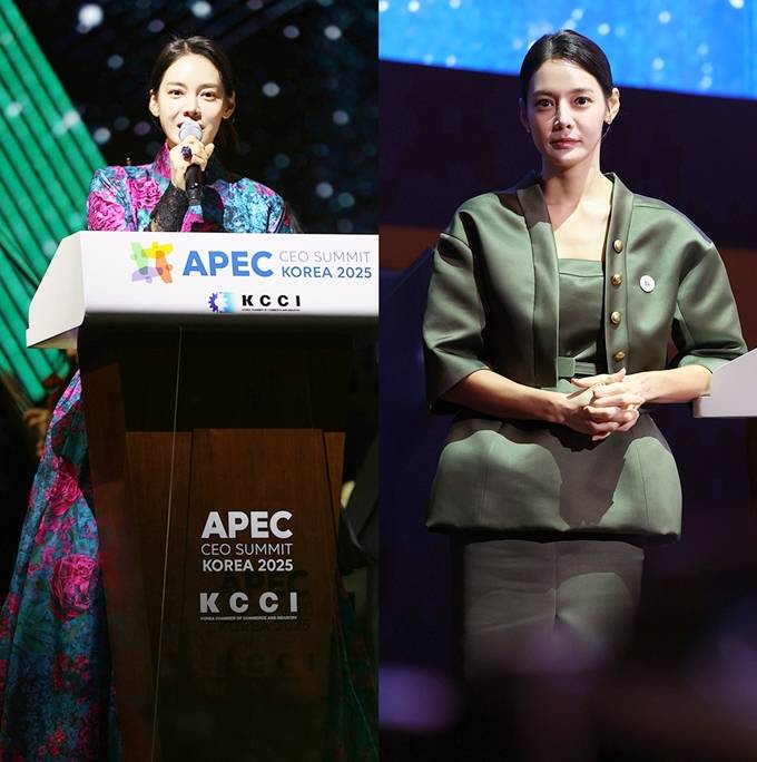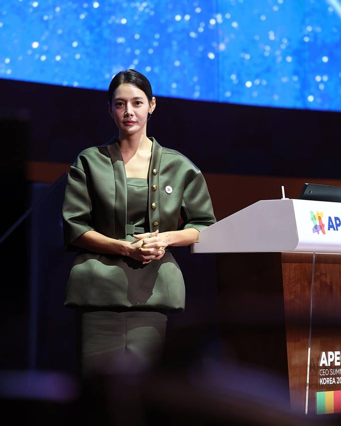 이어 29일과 30일 진행된 ‘APEC CEO 서밋 코리아 2025’에서는 각각 차분한 그린 컬러의 투피스 차림과 베이지 컬러의 수트 차림으로 등장해 회의 일정 전반에 걸쳐 고급스러운 영어로 자연스러운 진행을 펼쳤다.